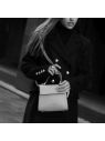 Небольшое изделие с короткой ручкой и съемным регулируемым плечевым ремнем закрывается клапаном на элегантный замок.