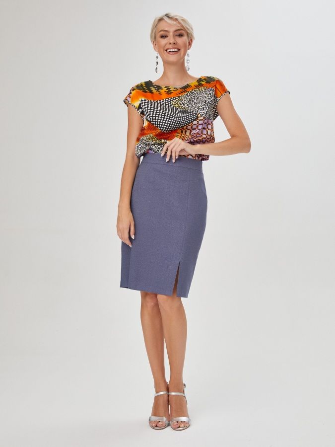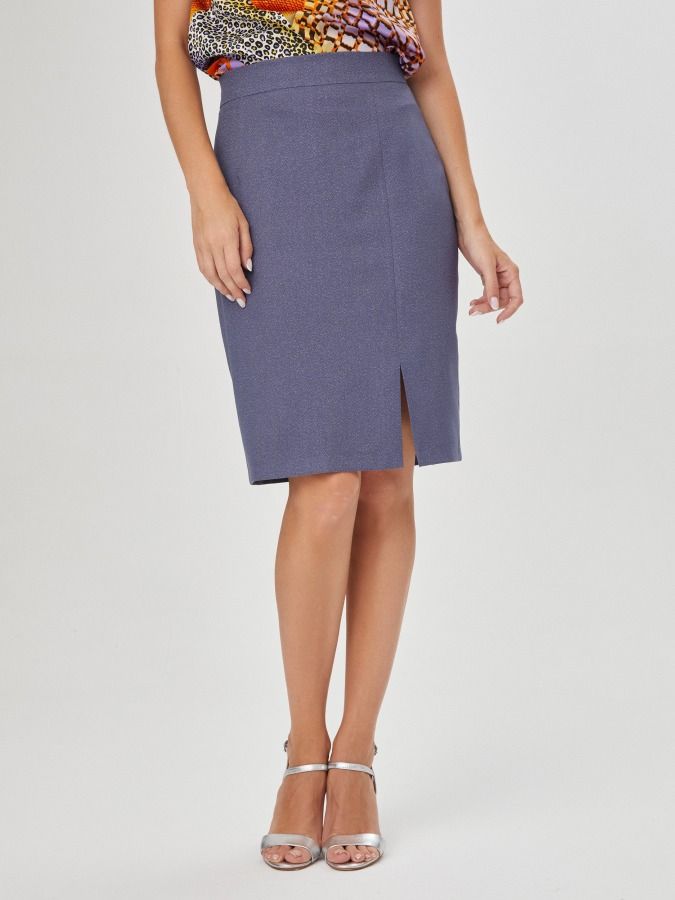 Для изготовления зауженной юбки длиной до колена выбрали серый материал. Металлизированные нити в составе создают мерцающий эффект, поэтому изделие не выглядит просто. Модель на подкладке с разрезом спереди отлично дополняет блузку Д-2058 ИВ(О2).