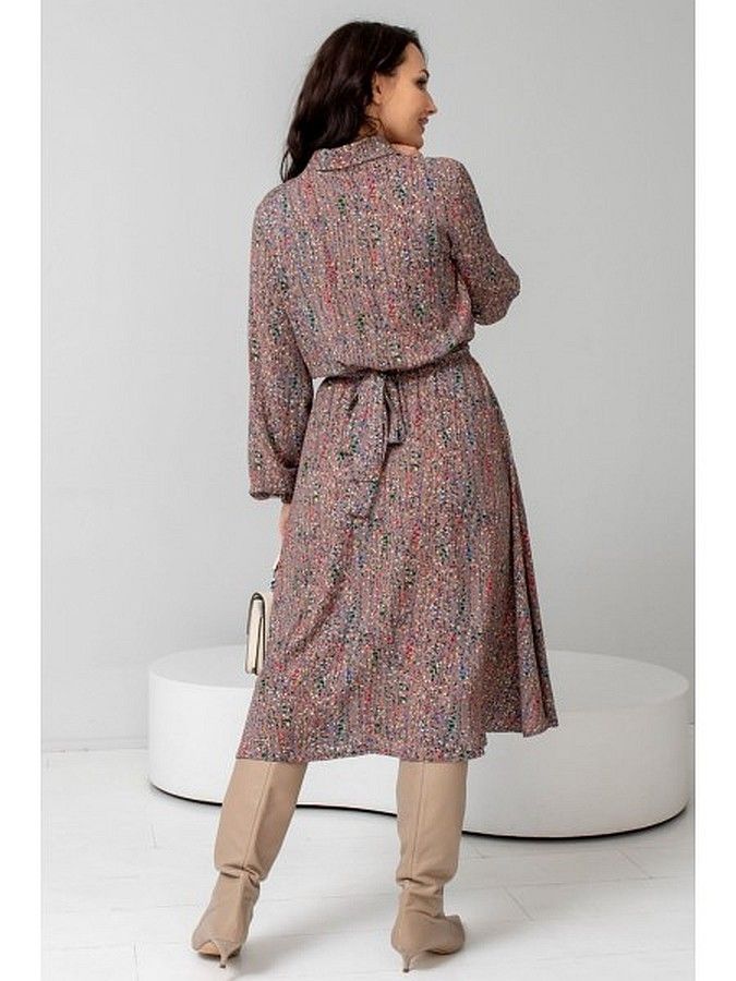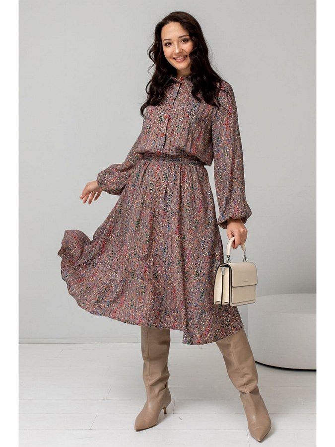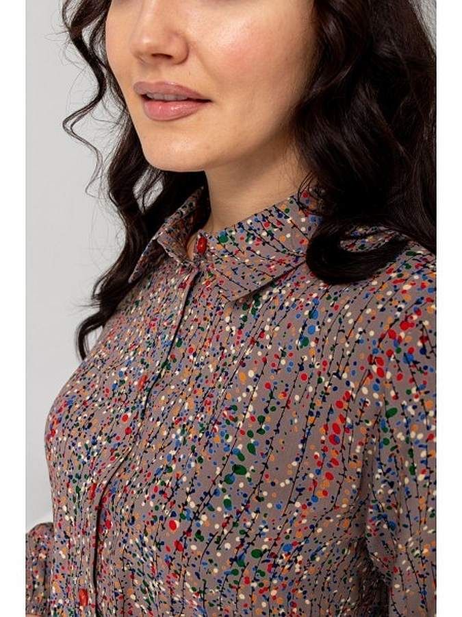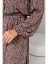Ткань; штапель-твил набивной. Платье-рубашка, отрезное по талии, воротник на стойке, спереди застежка на пуговицы до талии. Юбка расклешенная, в боковых швах карманы. К платью прилагается пояс. Рукав длинный, пышный.