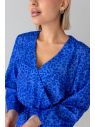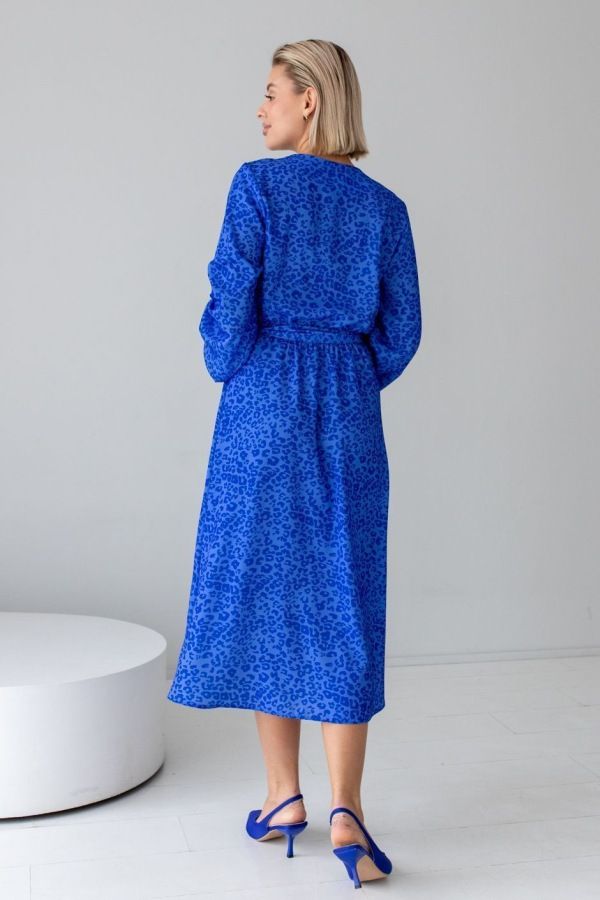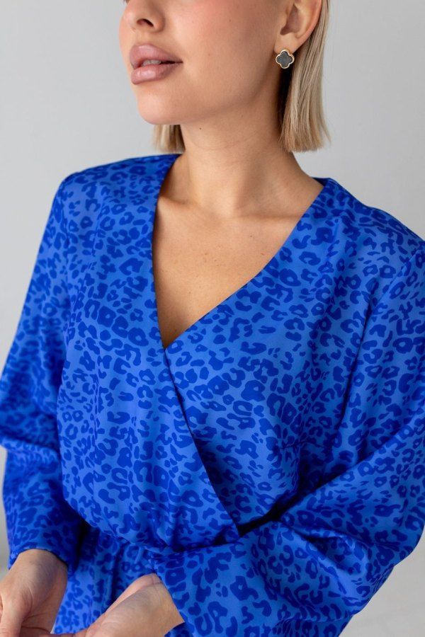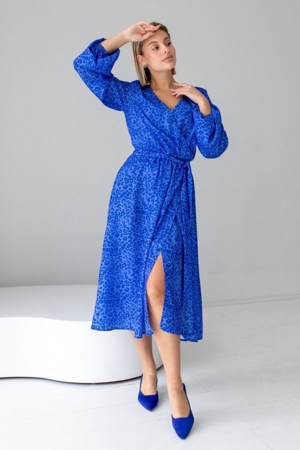Ткань: искусственный шелк набивной. Платье отрезное по талии, в верхней части вырез-запах, юбка расклешенная, с запахом. Рукав втачной, длинный, пышный, на манжете. Длина ок. 120см