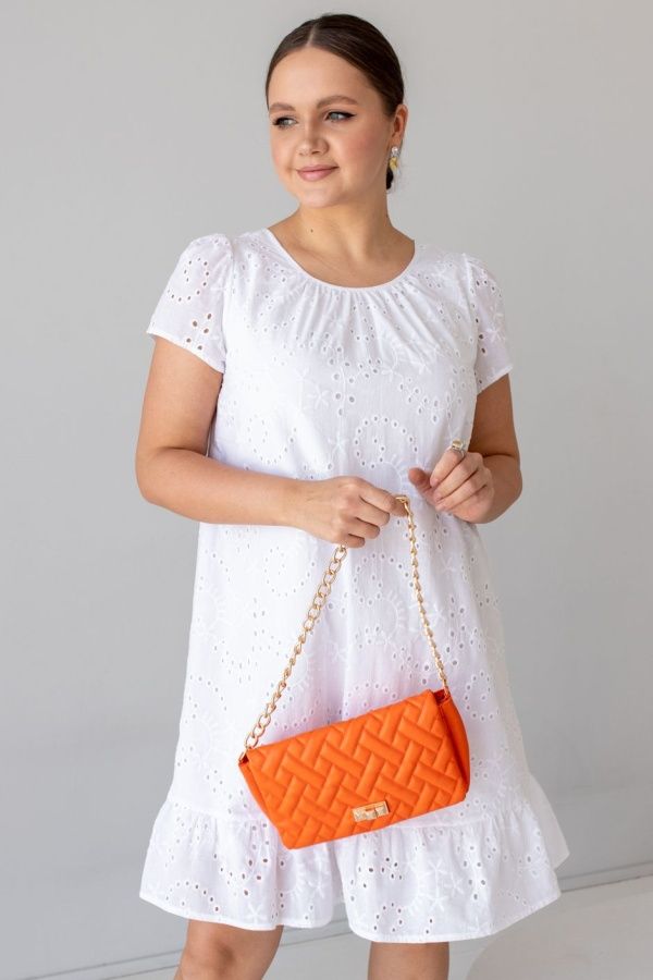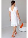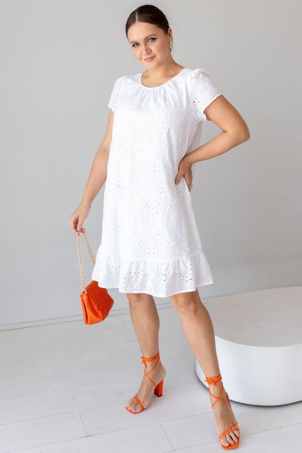 "Ткань: хлопок шитье.Платье А-образного силуэта, на подкладке,сзади глубокий V-образный вырез. спереди по вырезу сборка, по низу изделия волан.Рукав короткий. Длина ок.91 см.