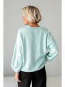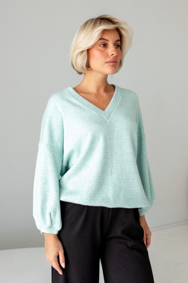 Ткань: трикотажное полотно однотонное. Джемпер свободного покроя, вырез V-образный, линия плеча занижена, низ изделия на ножке. Рукав ¾,на манжете. Длина ок. 65 см