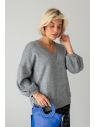 Ткань: трикотажное полотно однотонное. Джемпер свободного покроя, вырез V-образный, линия плеча занижена, низ изделия на ножке. Рукав ¾,на манжете. Длина ок. 65 см