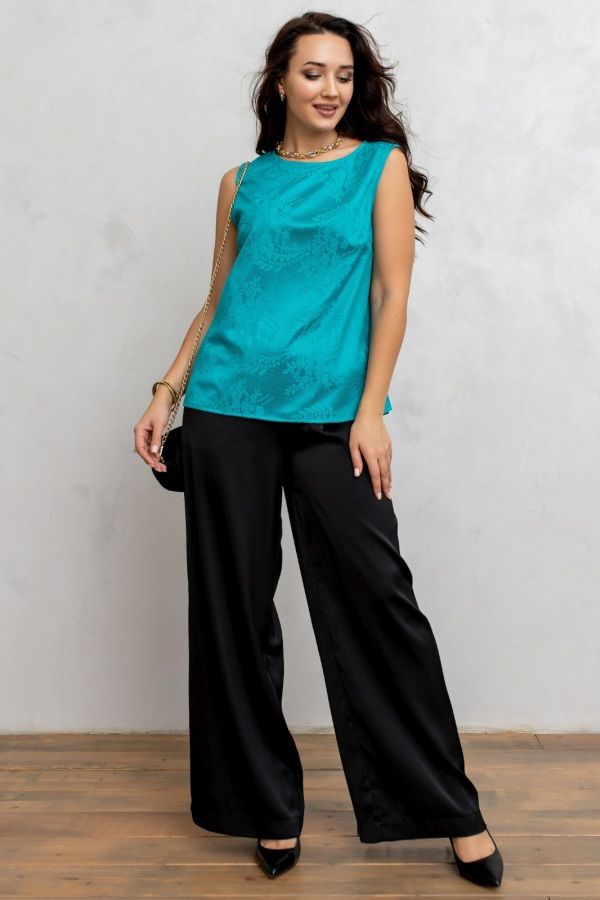 Ткань: вискоза-сатин плательная. Брюки «палаццо», высокая посадка, пояс на резине, в боковых швах – косые карманы. Длина по внутреннему шву ок.80см.