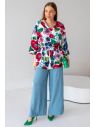 Ткань: вискоза однотонная с эффектом креш.Брюки с высокой посадкой, пояс на резине, в боковых швах – косые карманы, книзу сильно расклешенные, по наружному боковому шву высокий разрез. Длина по внутреннему шву ок. 80 см.