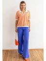 Ткань: вискоза однотонная с эффектом креш.Брюки с высокой посадкой, пояс на резине, в боковых швах – косые карманы, книзу сильно расклешенные, по наружному боковому шву высокий разрез. Длина по внутреннему шву ок. 80 см.