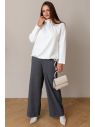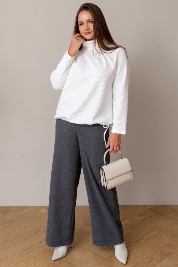 Ткань: трикотажное полотно джерси. Брюки расклешенные книзу, с высокой посадкой, в боковых швах – косые карманы, застежка на молнию. Длина по внутреннему шву ок.80см.