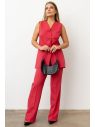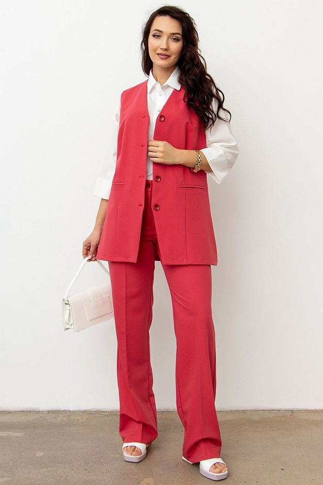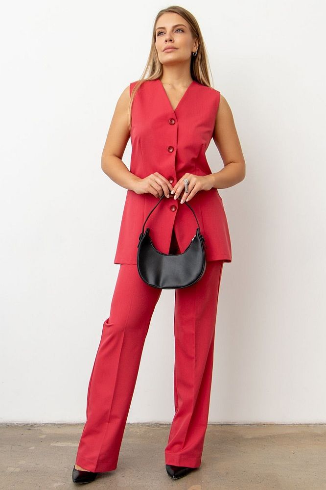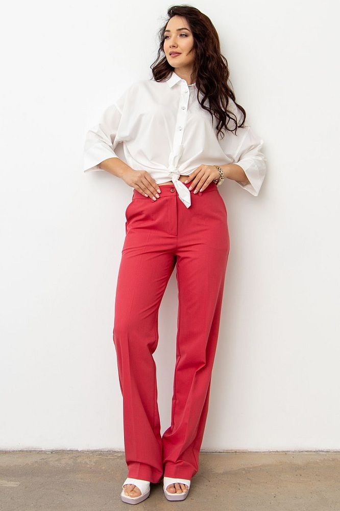 Ткань: костюмная однотонная. Брюки с широкими штанинами, с высокой посадкой, спереди застежка на молнию, в боковых швах косые карманы. Длина по внутреннему шву ок.84 см