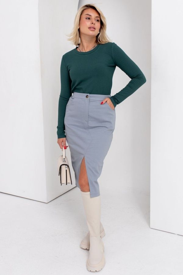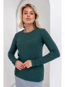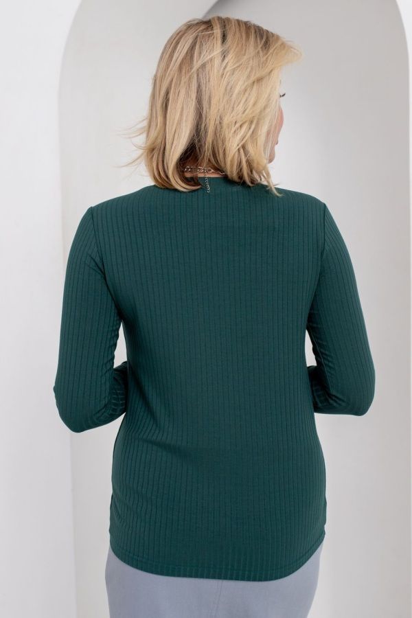 Ткань: трикотажное полотно с выработкой в резинку. Лонгслив полуприлегающего покроя, с небольшим вырезом. Рукав длинный. Длина ок.64см