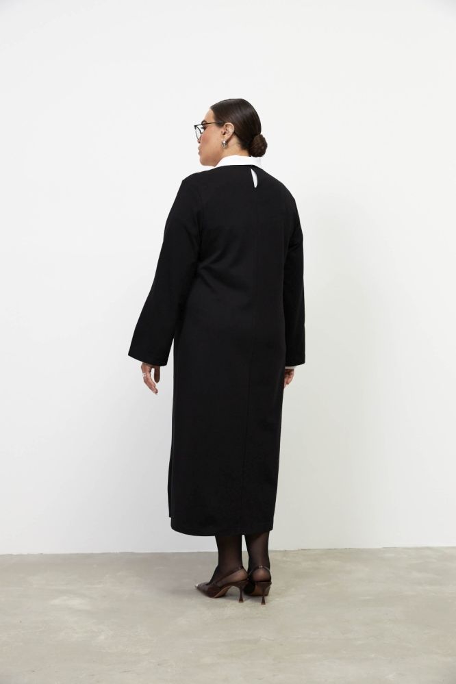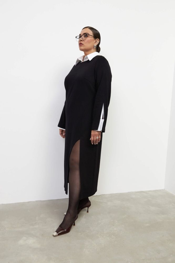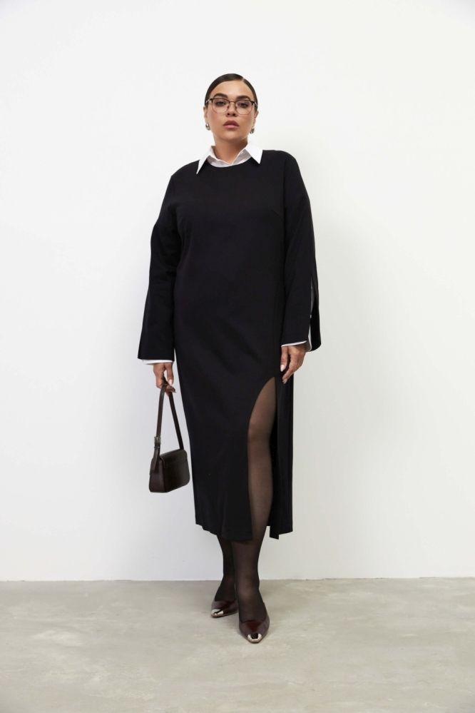 Прямое платье из плотного трикотажа с фигурным эффектным разрезом на ноге и разрезами на рукавах, горловина в форме лодочки, втачной рукав, платье без подклада.