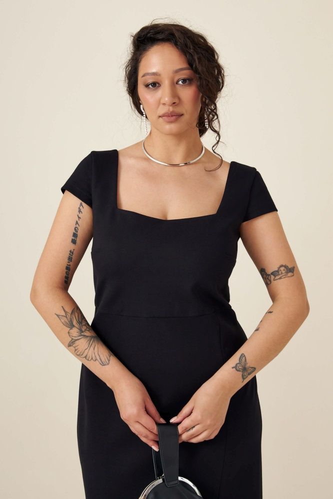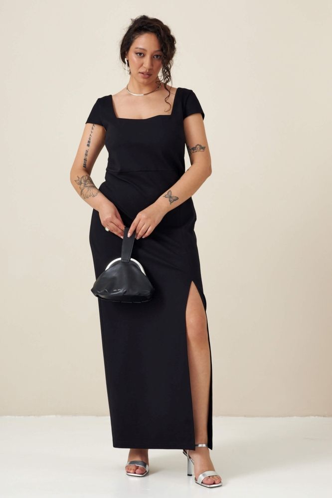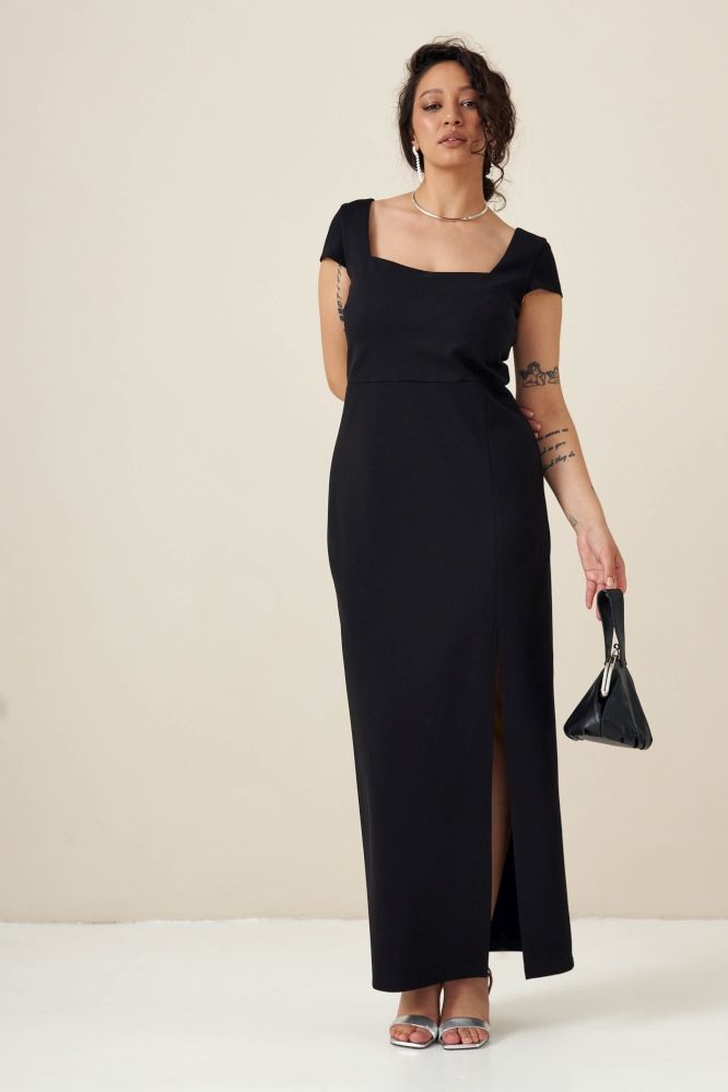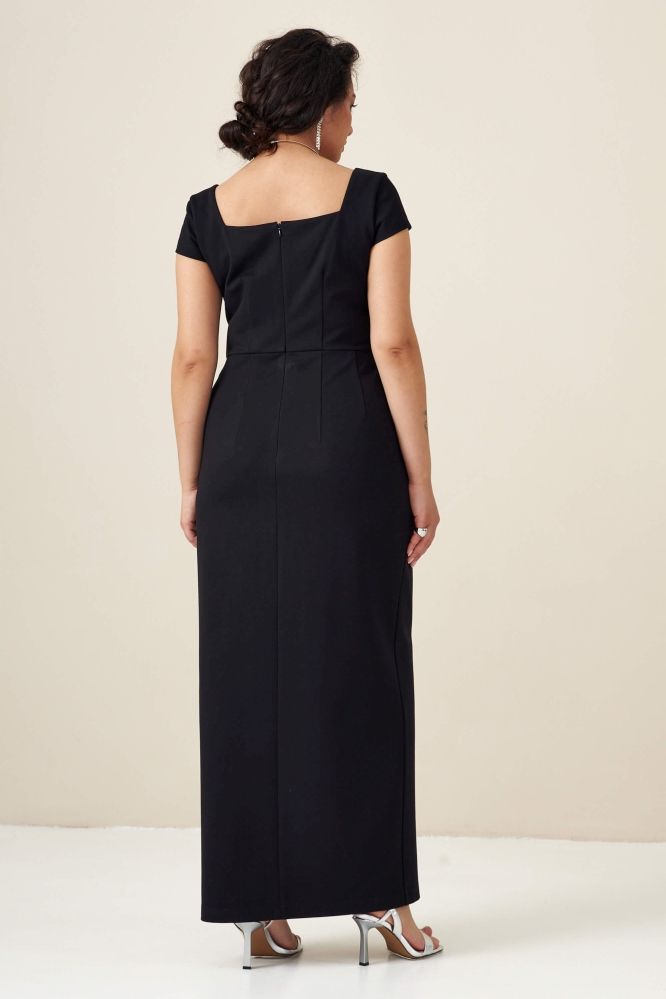 Модель прилегающего силуэта с аккуратным рукавом. Разрез по ноге, застежка на молнию. Лиф на подкладе. Изделие выполнено из плотного трикотажного полотна.