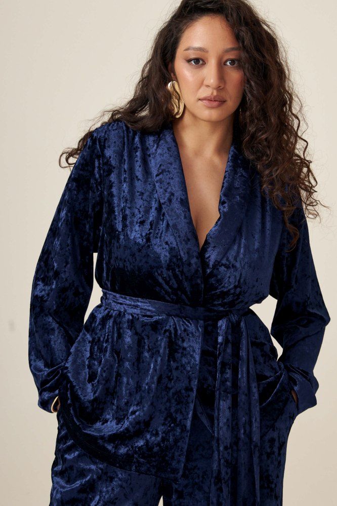 Однобортный прямой жакет из мраморного бархата среднего объема без подклада с втачным рукавом. Воротник шалевый, съемный пояс. На плече сборка для формирования складок.