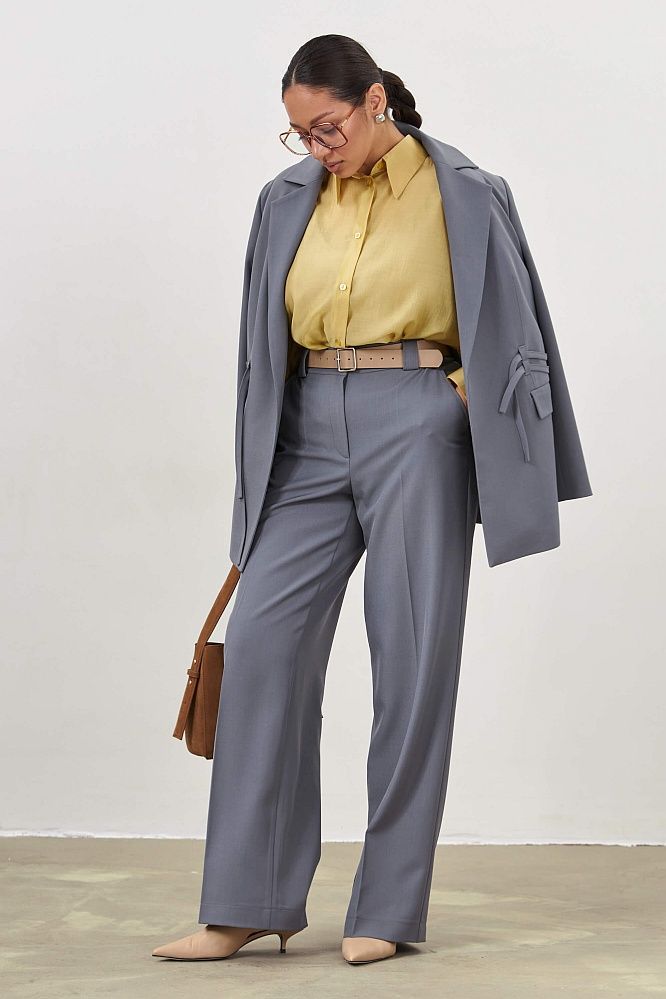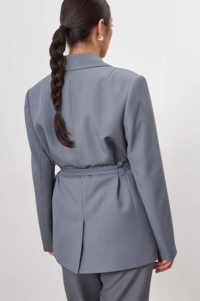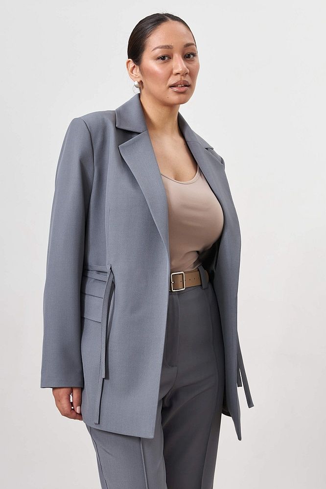 Жакет прямого силуэта c четкой линией плеча. Акцентные завязки на талии, шлица на спинке, карманы с клапаном.