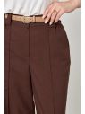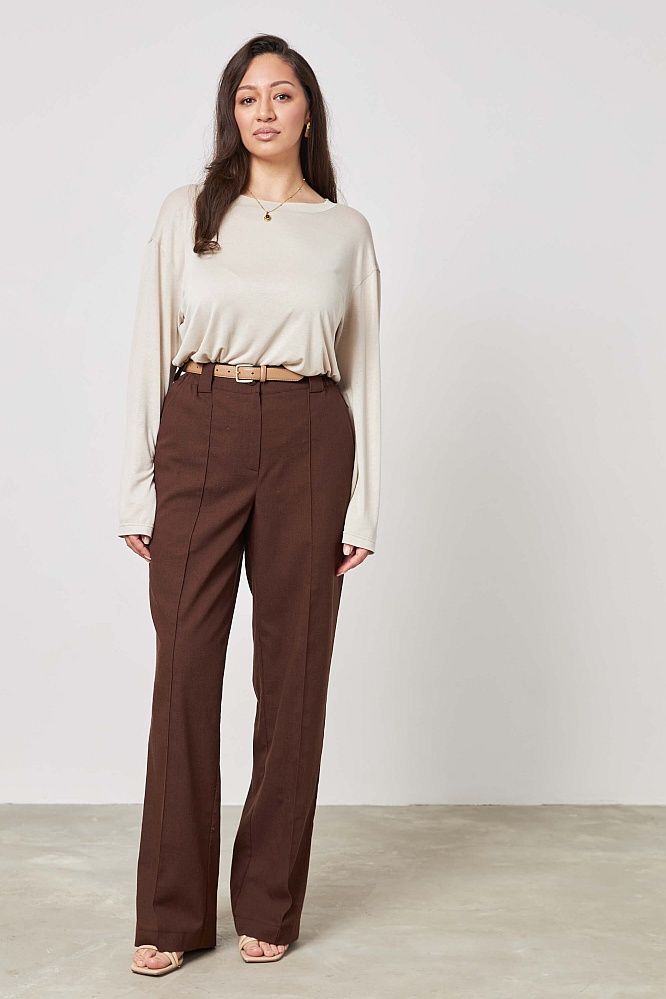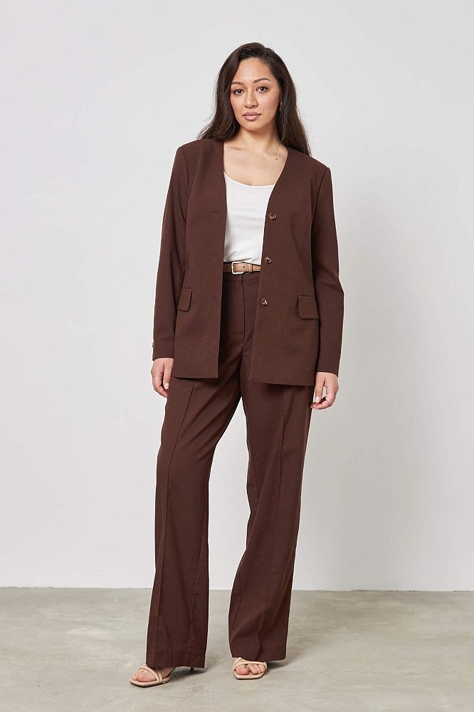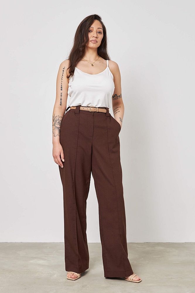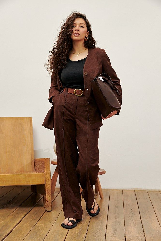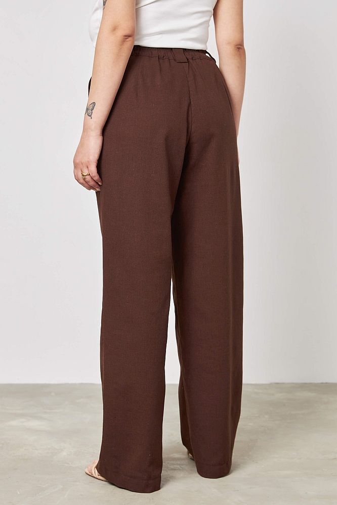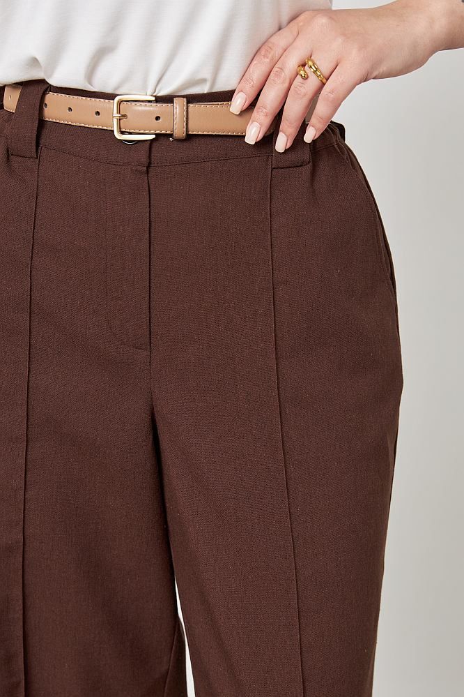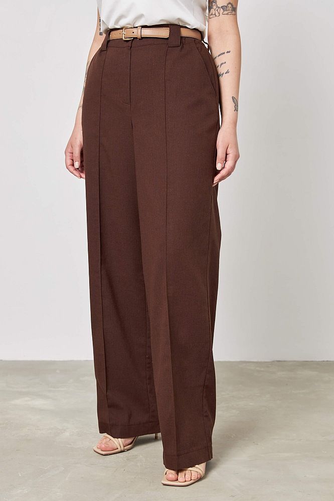 Брюки прямые широкие со стрелками, пояс на резинке, застежка на молнию и пуговицы, с боковыми карманами.