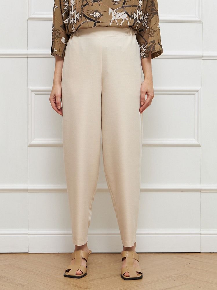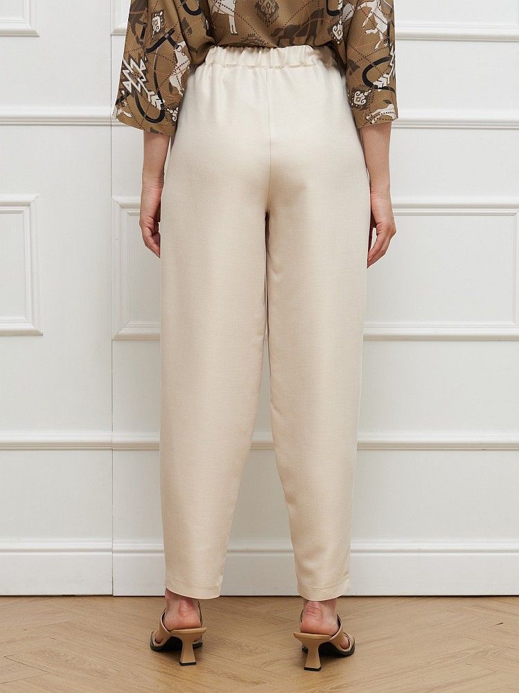 Молочные брюки силуэта каррот, с высокой посадкой, на широком эластичном поясе, с карманами в боковых швах. Модель выполнена из вискозного струящегося материала, который хорошо пропускает воздух и приятный к телу. На фото брюки представлены с блузкой Д-801 ЭРМ(Л5).