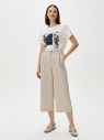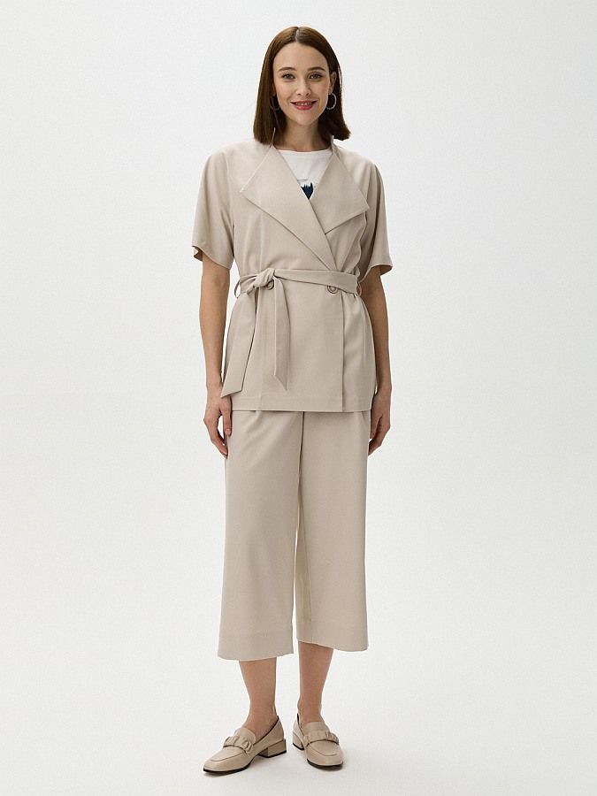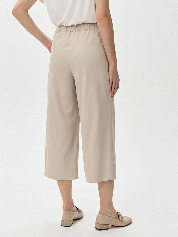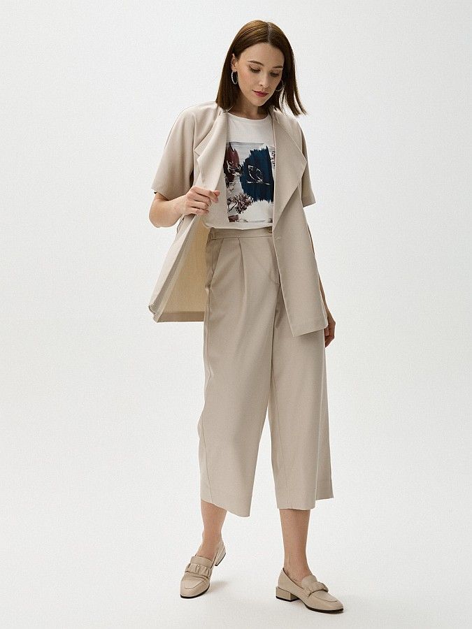 Укорочённые брюки-кюлоты оттенка слоновой кости помогут составить лаконичный образ. Модель с классической посадкой, боковыми карманами и глубокими складками на талии выполнили из плотного материала с хлопком, вискозой и эластаном. Безупречная посадка на талии достигается резинкой в поясе на спинке. Застежка-гульфик. Отличная пара жакету В-910 КИН(В3), блузке Д-2055 ТУМ(В3) и джемперу С-22 ТТМ(В3).