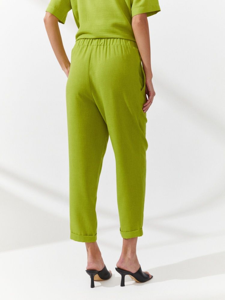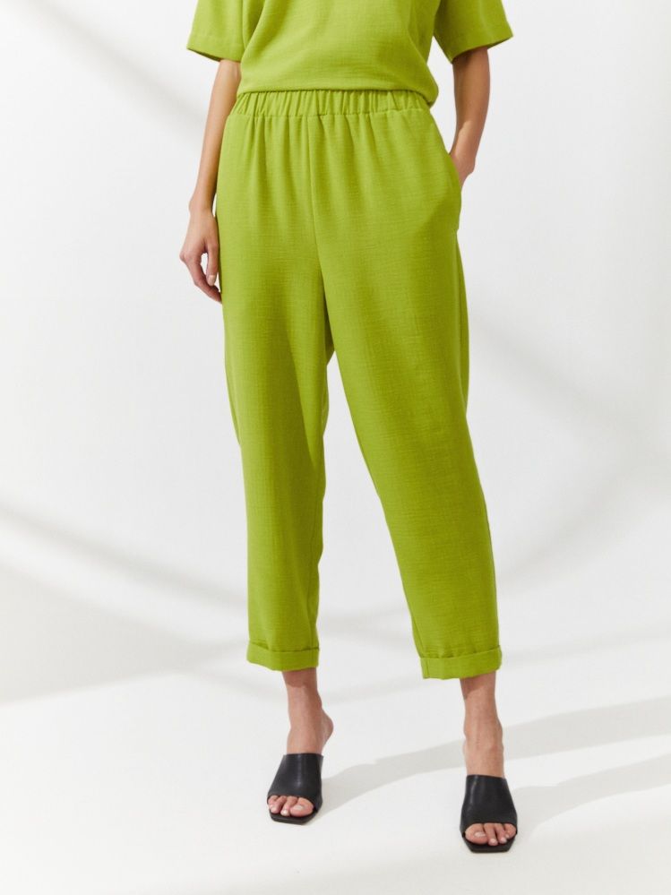 Свободные брюки длины 7/8, с глубокими карманами в боковых швах, с деликатным заужением к щиколотке выполнены из дышащего материала на основе вискозы и хлопка. Комфортная модель, не сковывает движения, дополнена отворотами по низу и широким эластичным поясом.