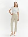 Прямые бежевые брюки в тонкую бирюзовую полоску визуально выстраивают удлиняющую силуэт вертикаль и отлично подстраиваются под любой образ. Для пошива модели с карманами и застёжкой-гульфик использовали мягкий вискозный материал с добавлением эластана, по внешнему виду напоминающий льняное полотно, только гораздо комфортнее. На фото брюки представлены с джемпером С-21 ТОЛ(В3) с жакетом В-904 БАЙ(В3).