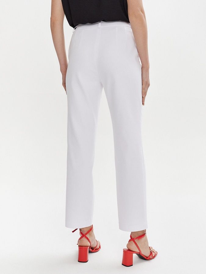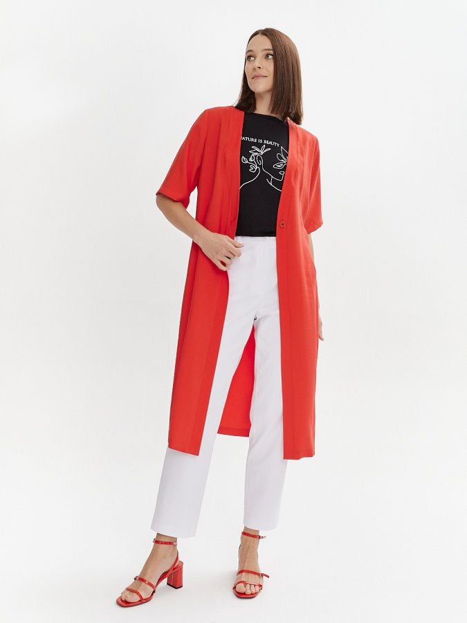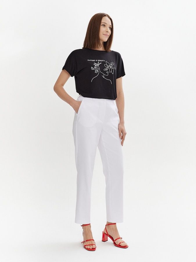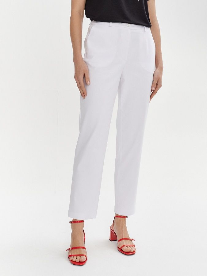 Прямые белоснежные брюки сшили из премиального хлопка, длинные волокна которого мягче, тоньше и прочнее обычного. Чтобы модель из такого дышащего материала не сковывала движения и не вытягивалась в коленях, в состав добавили стрейчевые нити. Высокая посадка, боковые карманы, застежка гульфик. Для кожаного ремня предусмотрены шлёвки. Комфортные белые брюки - основа летнего гардероба. Рекомендуем сочетать с летними жакетами, блузками и джемперами. На фото брюки представлены с джемпером С-22 ЧПР(В3).