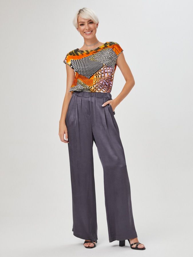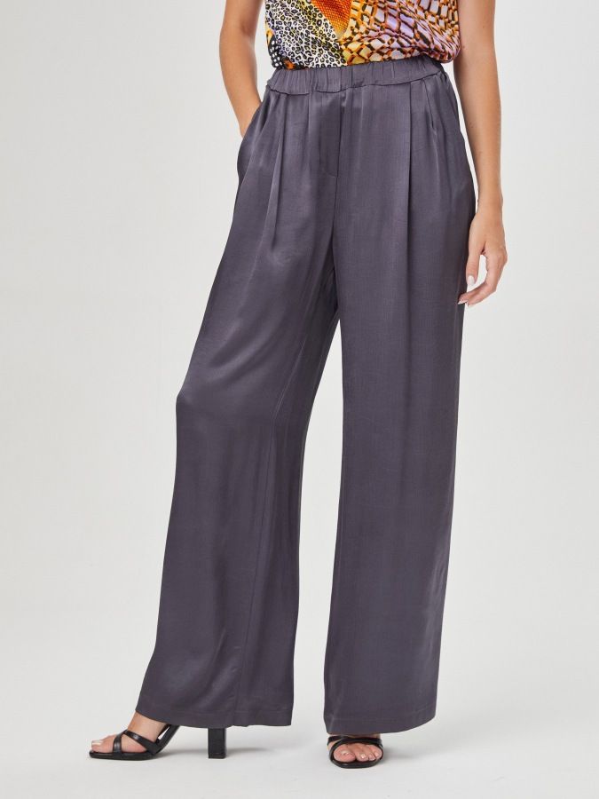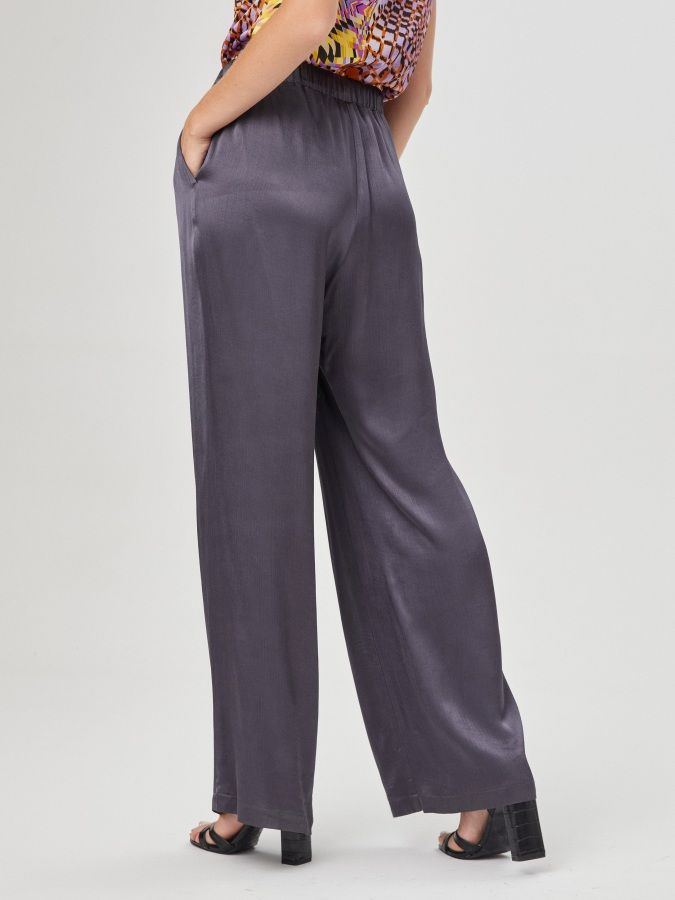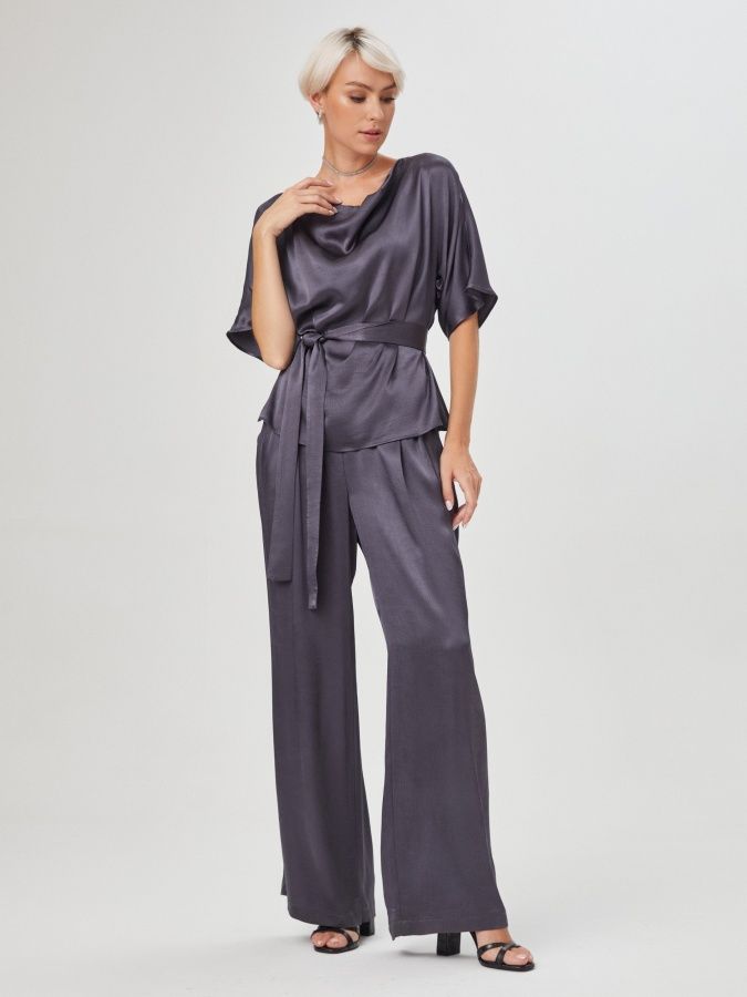 Очищенные от декора темно- серые брюки с высокой посадкой и широким поясом-резинкой сшиты из плотного вискозного щёлка. Струящийся материал с атласным блеском создает праздничное настроение, а крой не ограничивает свободу движений. На фото брюки представлены с блузкой Д-214 ХОС(О2).