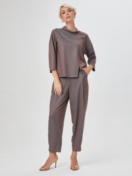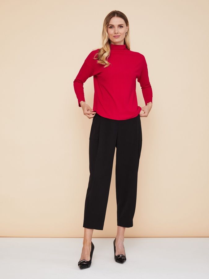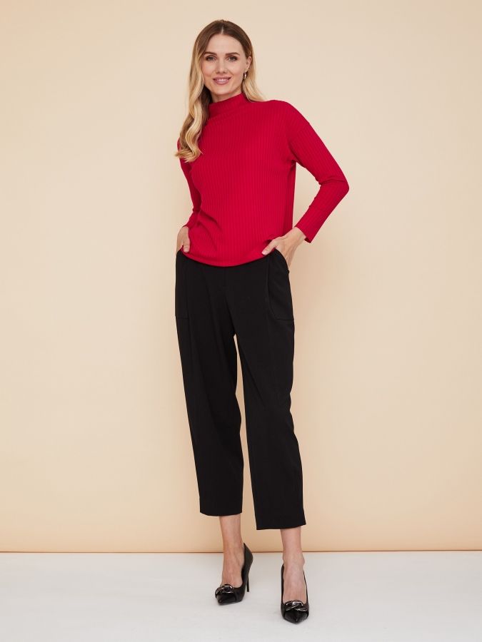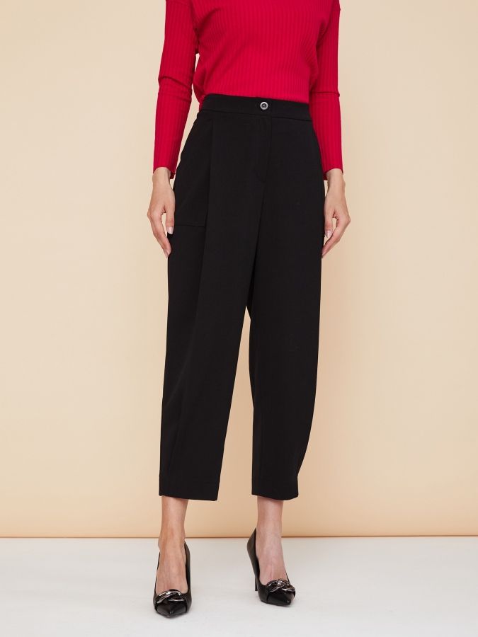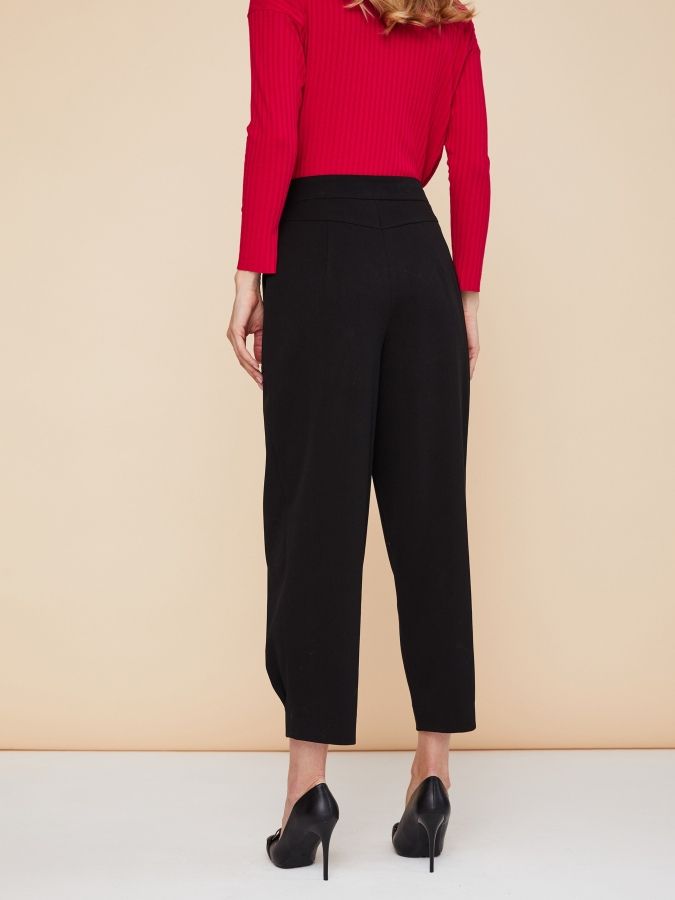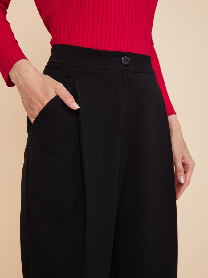 Черные брюки могут стать ключевым объектом в образе благодаря крою. Свободный силуэт с глубокими складками и накладными карманами спереди, заузили к низу и застрочили складки у боковых швов по низу. Широкий пояс на талии, отрезные кокетки на спинке и весь крой создают модель в лучших традициях стиля 1980-х. Завершающим штрихом стали отчетливые стрелки. Изделие сшили из плотной костюмной ткани, которая хорошо держит форму и не вытягивается. Шикарная модель, делающая фигуру необыкновенно женственной и привлекательной, сочетается с самыми разными блузками, джемперами и жакетами. На фото брюки представлены с джемпером С-11 ЯГ(О2).
