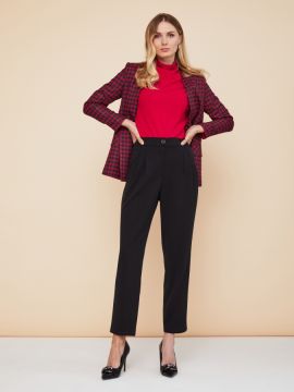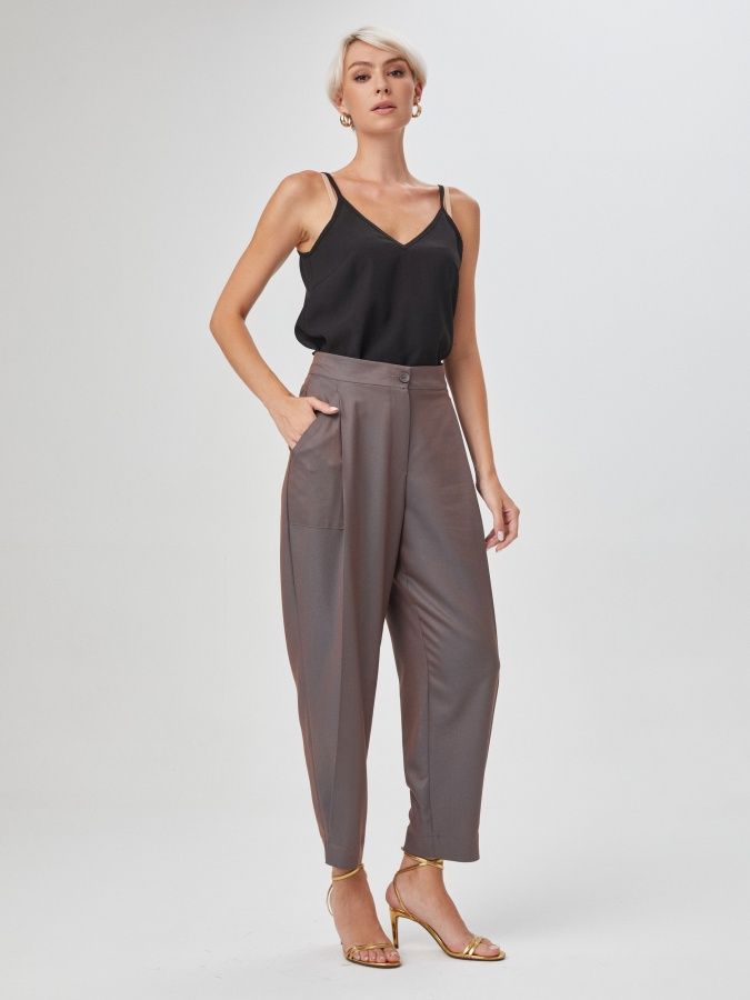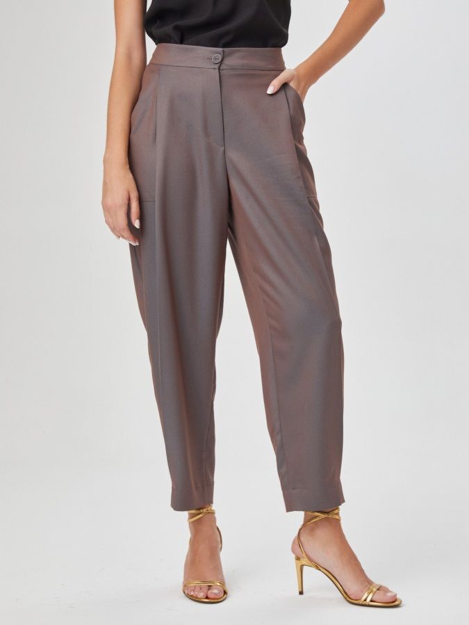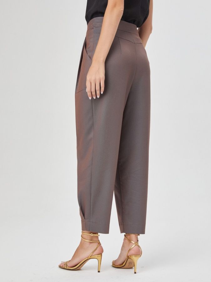 Укороченные коричневые брюки с глубокими складками и фигурной кокеткой сзади создают женственный силуэт. Высокая посадка и прямой пояс подчеркивают талию. Модель с накладными карманами и гульфиком сшита из почти немнущегося материала с легким блеском. Советуем носить с парной блузкой Д-212 УС(О2).