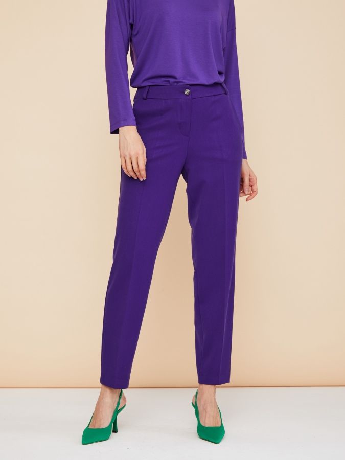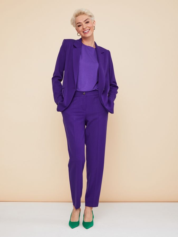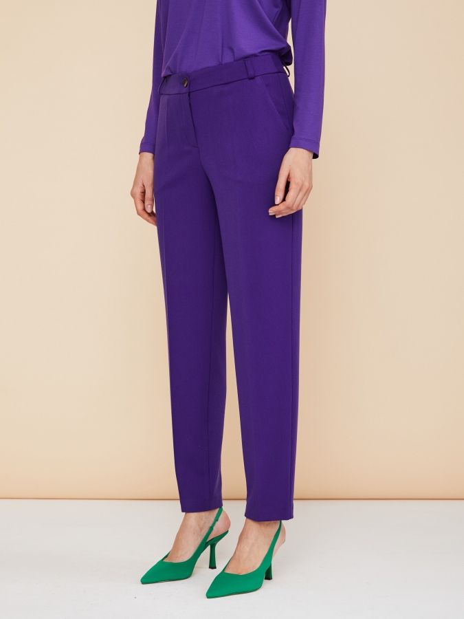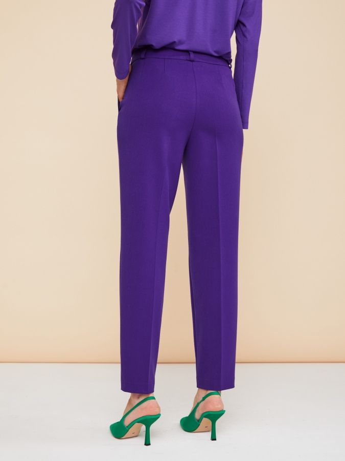 Фиолетовые брюки могут стать базовыми, несмотря на насыщенный цвет. Зауженная книзу модель со стрелками длины 7/8 оптимально облегает фигуру и хорошо смотрится с любой обувью. Застежка гульфик, шлевки для кожаного ремня, боковые карманы. Брюки выполнены из мягкой костюмной ткани, которая не пилингуется и не вытягивается при носке. На фото брюки представлены с жакетом В-911 КОР(О2) и джемпером С-26 ВИН(О2).