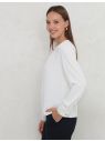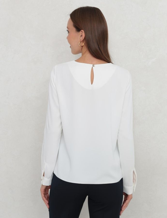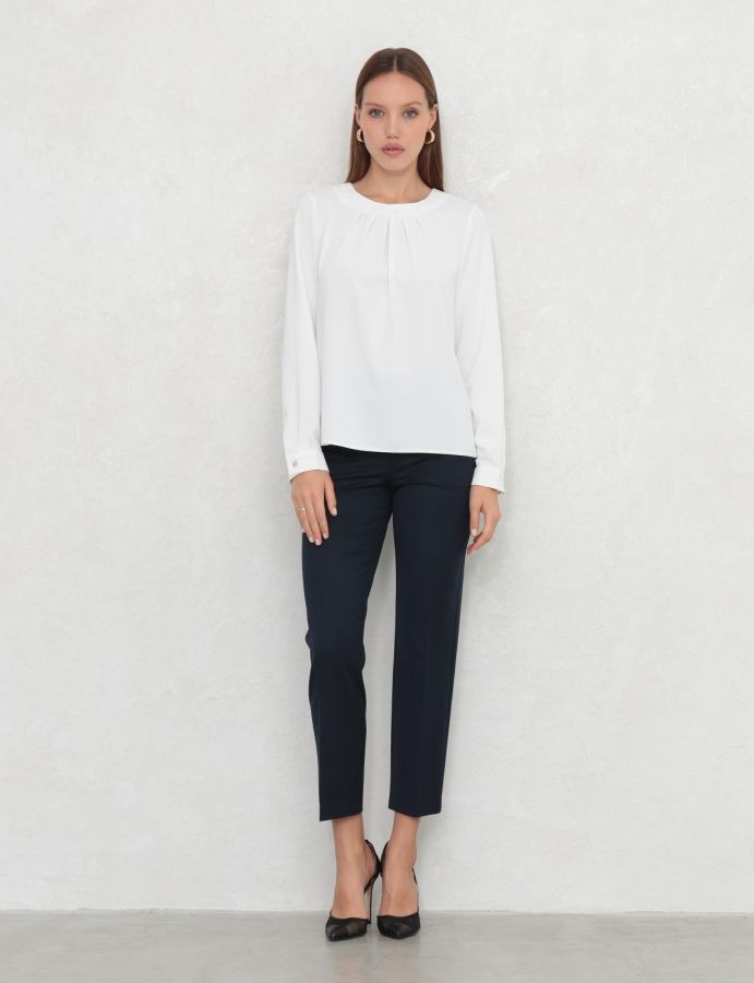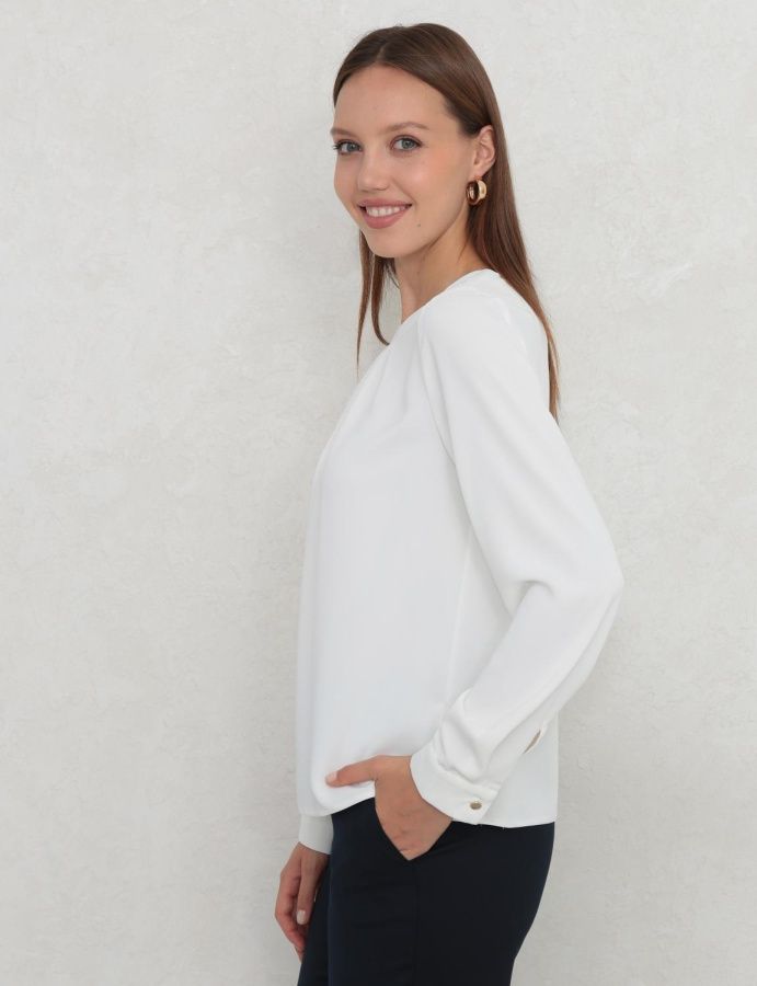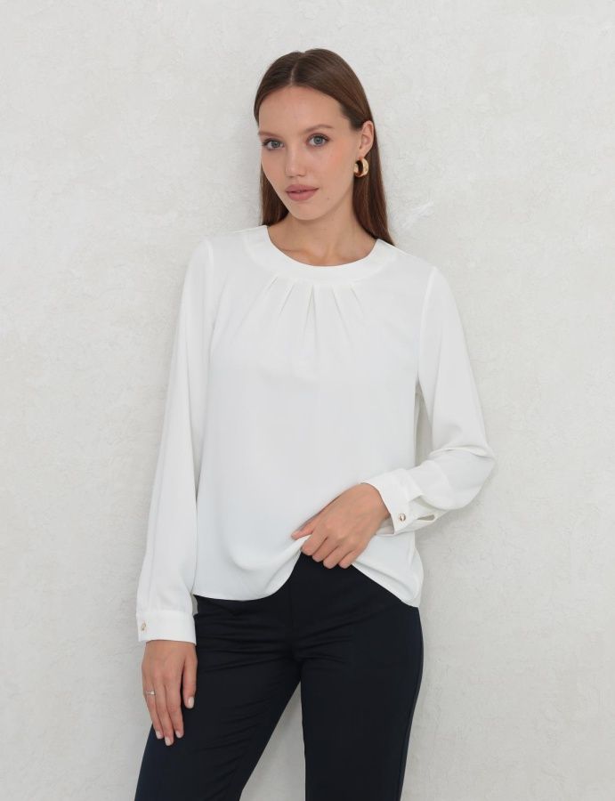 Блуза прямого кроя. Центральная складка встречная, остальные складки направлены к центру. Рукава втачные с манжетой, застегиваются на пуговицу.