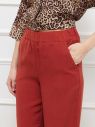 Широкие брюки, на эластичном поясе, с боковыми карманами, выполнены из жатой ткани кирпичного оттенка. На фото брюки представлены с блузками Д-221 ХАТ(Л5) и Д-237 ЛЕО(Л5).