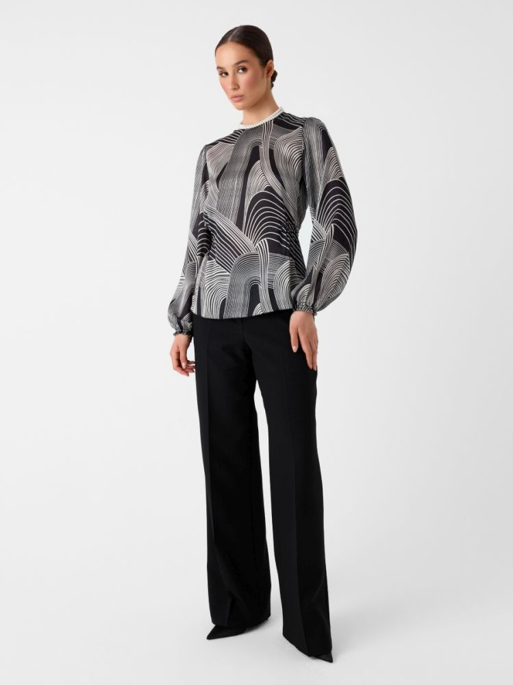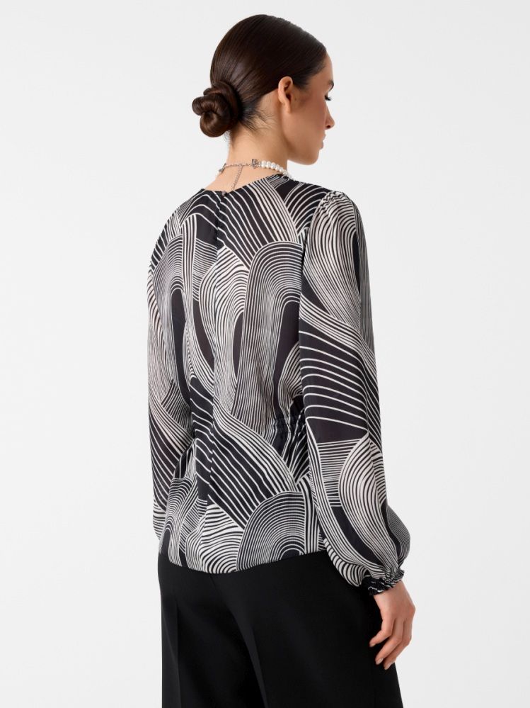 Универсальная блузка, которую можно носить как на каждый день, так и в качестве вечернего варианта. Она идеально комплектуется с черными низами, которые являются must-have в каждом гардеробе. Блузка имеет круглую горловину и длинные рукава, которые создают элегантный и уютный образ. Напуск на рукавах придает блузке легкость и воздушность. Талию формируют боковые сборки на резинке, которые придают фигуре женственные изгибы и обеспечивают комфортную посадку. Модель выполнена из шелковистого атласа с деликатным блеском и универсальным графичным принтом в стилистике ар-деко.