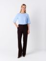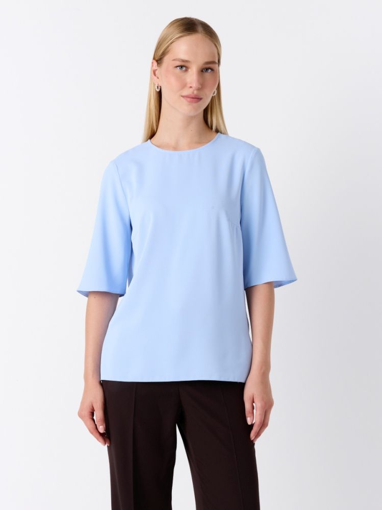 Базовый топ в нежно-голубом цвете из крепа. Прямой силуэт, удлиненный рукав, прикрывающий локоть, застежка ну пуговицу по спинке. Отлично сочтается с костюмной группой коллекци, брюками и вязаными кардиганами.