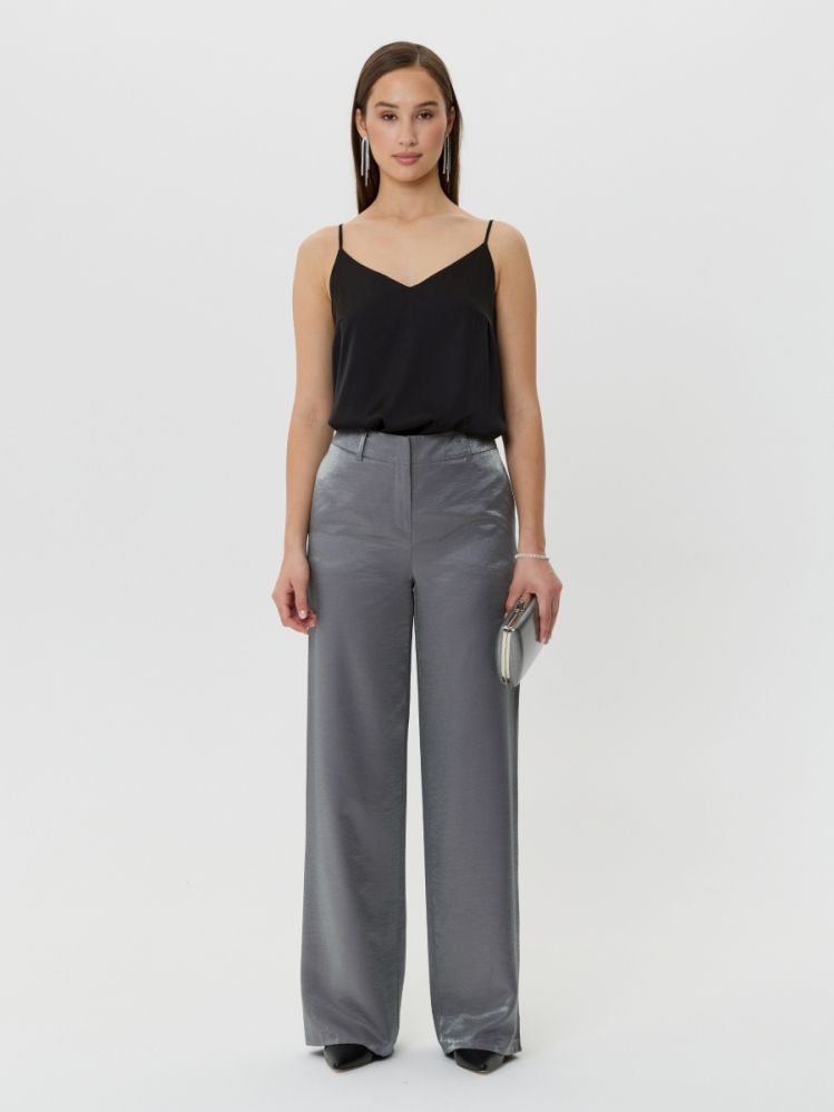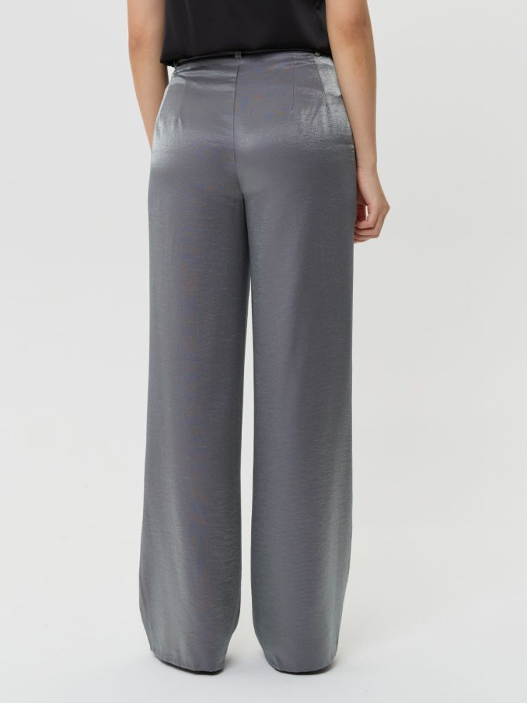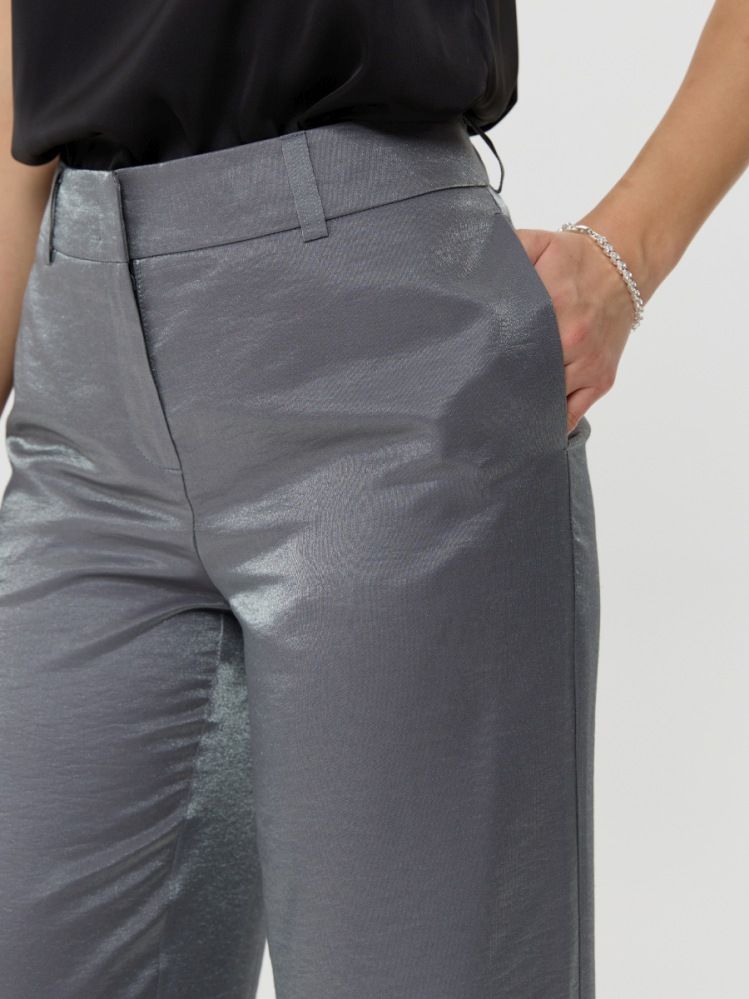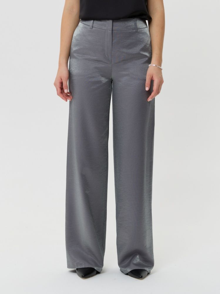 Стильные брюки прямого силуэта из мерцающей ткани стального оттенка станут ярким дополнением вашего гардероба. Полная длина и идеальная посадка, обеспеченная двойной вытачкой по спинке. Пояс оснащен шлевками для ремня, а застежка на крючки и молнию добавляет удобства и надежности. Эти брюки визуально стройнят и вытягивают силуэт, идеально сочетаются с жакетом 2.3.3-881 и корсетом 2.71.1-372 из коллекции. Создайте гармоничный и модный образ с этими великолепными брюками.