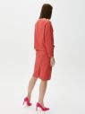 Укороченная блузка прямого кроя привлекает внимание не только ярким цветом, но и актуальным мотивом пье-де-пуль (гусиная лапка) из малиновых и оранжевых нитей. Для пошива изделия со спущенной линией плеч и длинными зауженными книзу рукавами использовали мягкую ткань, напоминающую по свойствам трикотаж. Блузка комфортно облегает фигуру, не сковывает движения и практически не мнётся. Модель дополнили боковыми хлястиками с пуговицами. Отличная пара юбке А-2009 ФИЗ(В3).