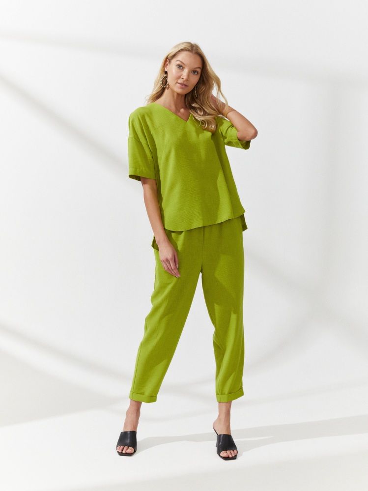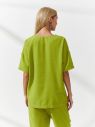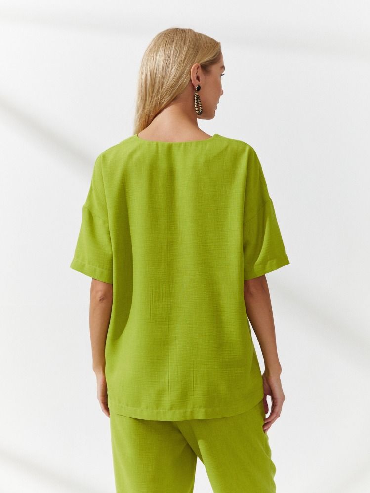 Блузка лаконичного кроя с удлиненной спинкой, фигурным низом и боковыми разрезами выглядит свежо благодаря насыщенному салатовому оттенку. Модель с V-образной горловиной, спущенной линией плеча и короткими рукавами выполнили из дышащего материала на основе хлопка и вискозы.