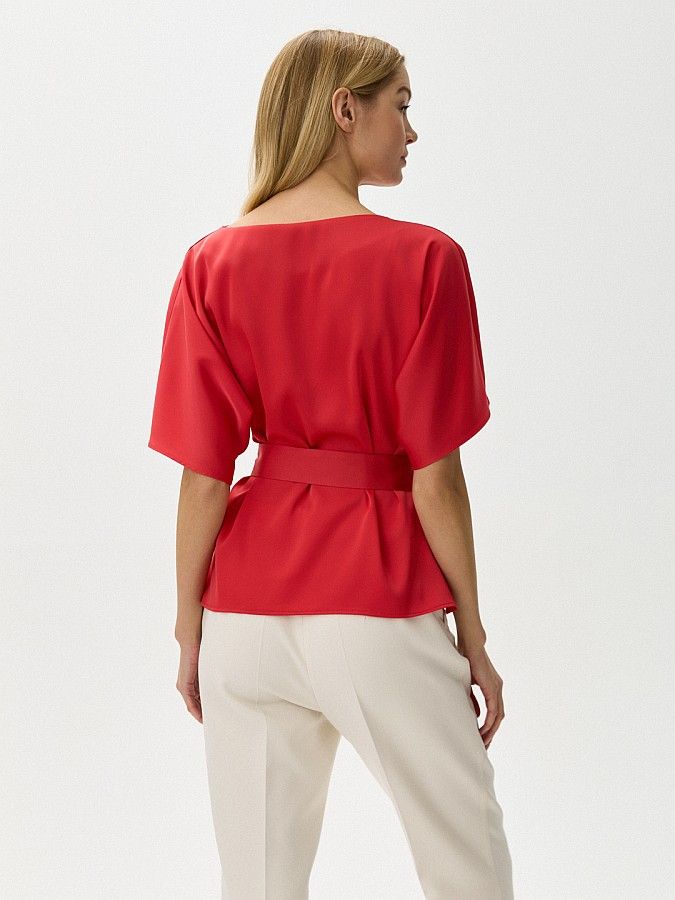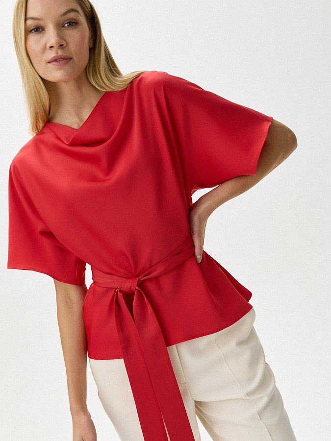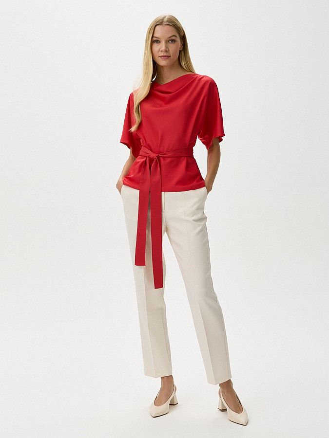 Насыщенный красный цвет блузы с цельнокроеными короткими рукавами выглядит особенно ярко в тандеме с материалом, который выбрали для пошива изделия. Модель прямого кроя выполнили из тонкого струящегося материала с атласным блеском. Горловина драпируется мягкими складками, талия подчёркнута длинным поясом. Наиболее выигрышно блузка смотрится в паре с молочными брюками Б-2008 ЛАД(В3).