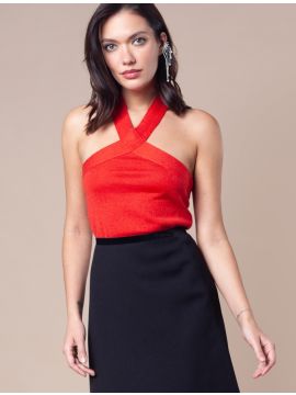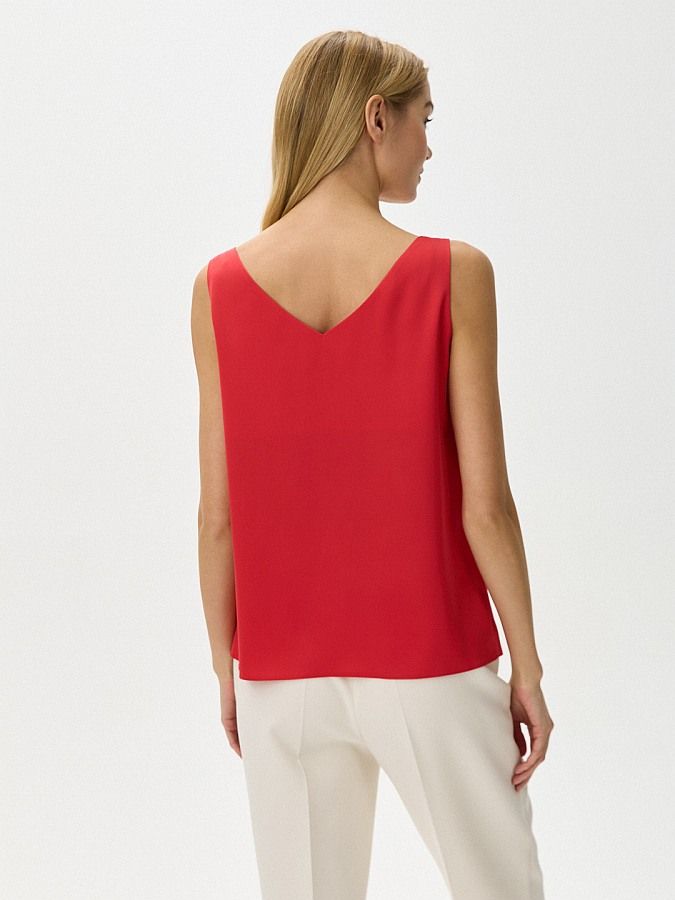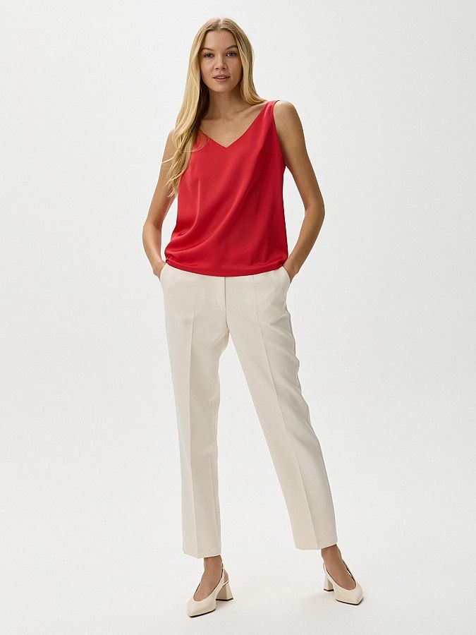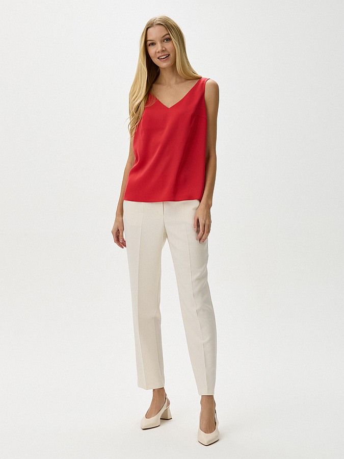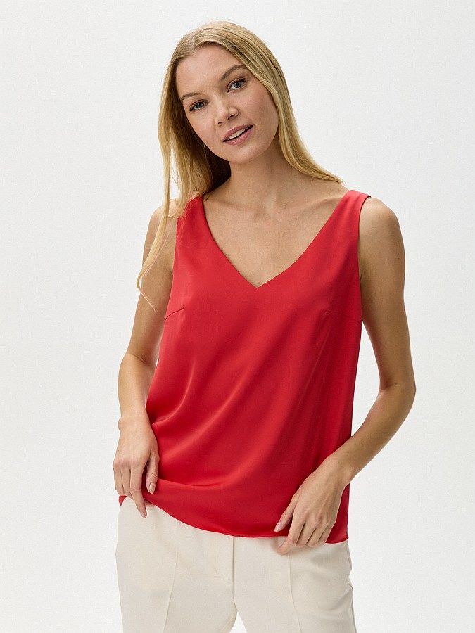 Ярко-красному топу на узких бретелях не нужен богатый декор, чтобы привлечь внимание. С этой задачей отличной справляется плотный шелковистый атлас, который деликатно переливается в лучах света и приятно охлаждает кожу. Модель с V-образной горловиной и приоткрытой спиной гармонично впишется как в повседневный образ, так и в коктейльный наряд. На фото топ представлен с брюками Б-2008 ЛАД(В3). Отличная база под жакет В-930 ЛАД(В3)