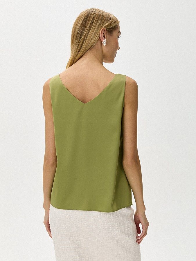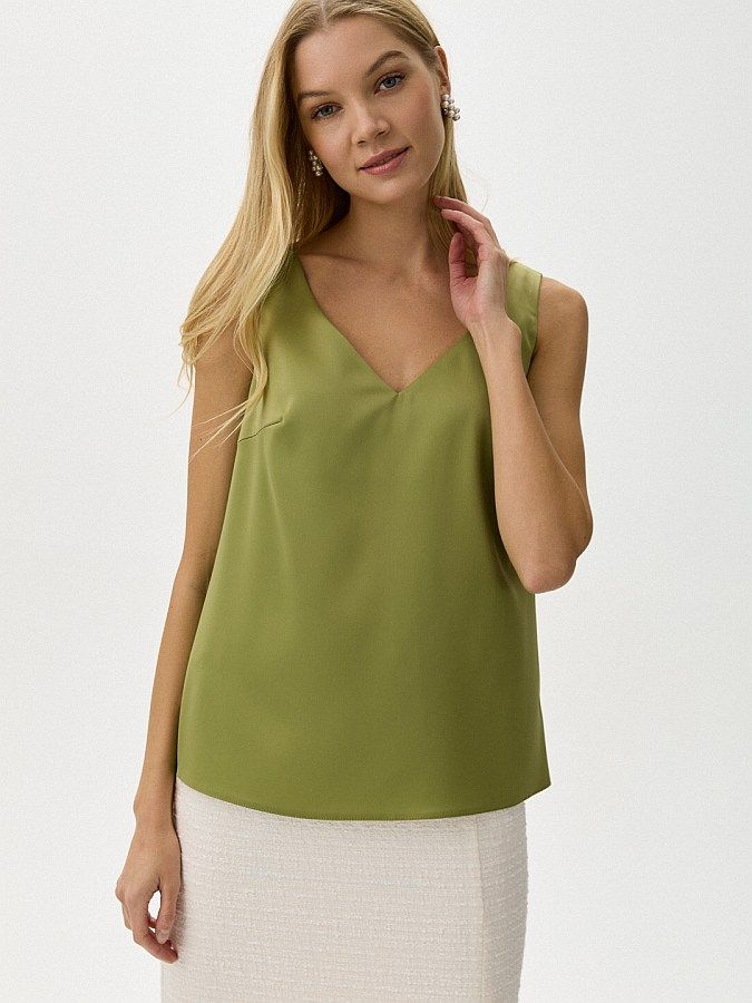 Блузка-топ на узких бретелях с Vобразной горловиной – простой и верный способ ввести весну в повседневный гардероб. Нежный салатовый оттенок только выиграл от материала: для производства модели выбрали гладкий атлас с характерным блеском. Изделие немного тянется, облегая фигуру и практически не мнётся. Идеальная база под жакет В-936 ФАМ(В3), юбку А-2018 ФАМ(В3) и А-2019 АЗ(В3).