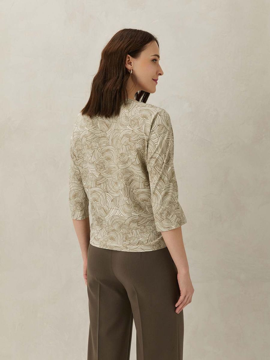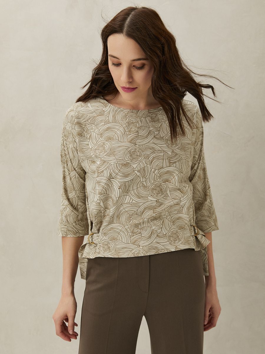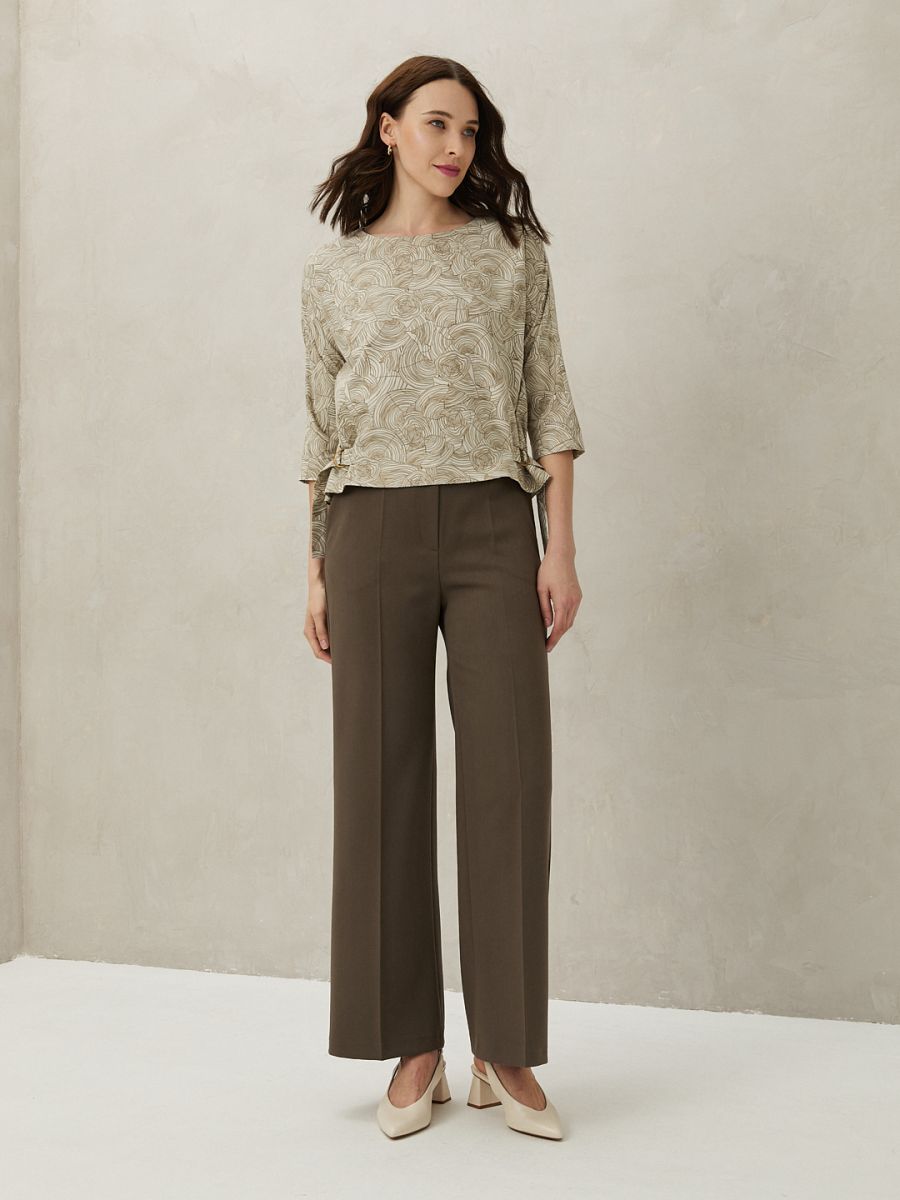 Блузка прямого кроя, с цельнокроеными рукавами длины 3/4, выглядит воздушной, благодаря ""бархатистой"" ткани с размытым абстрактным принтом. Прилегание по низу регулируется патами с пряжками. Модель с овальной горловиной настолько лёгкая и мягкая, что почти не ощущается на теле. На фото блузка представлена с брюками Б-2021 ИНС(О3)."