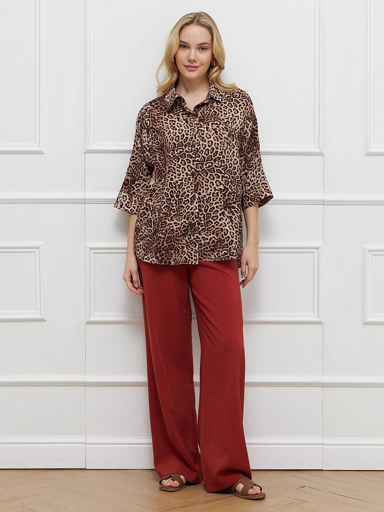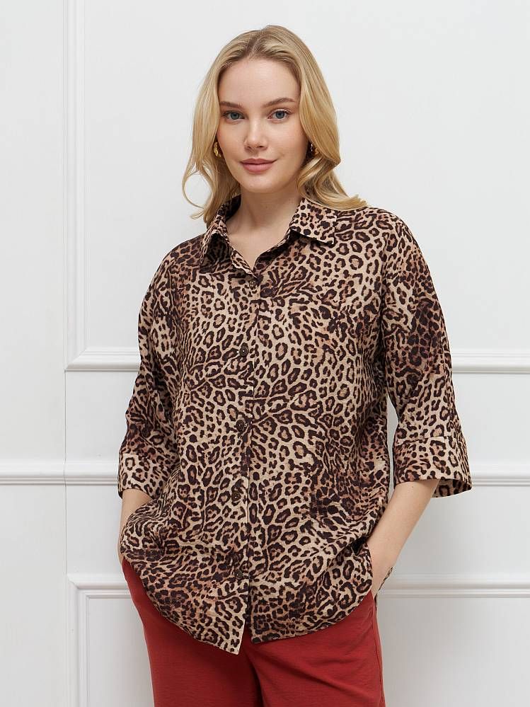 Блуза-рубашка свободного кроя, с цельнокроеными рукавами 3/4, сшита из легкой ткани с креш эффектом, на основе вискозы, с анималистичным принтом. Модель с широкой кокеткой дополнена складкой на спинке. Предлагаем создать образ с брюками Б-900 ХАТ(Л5).