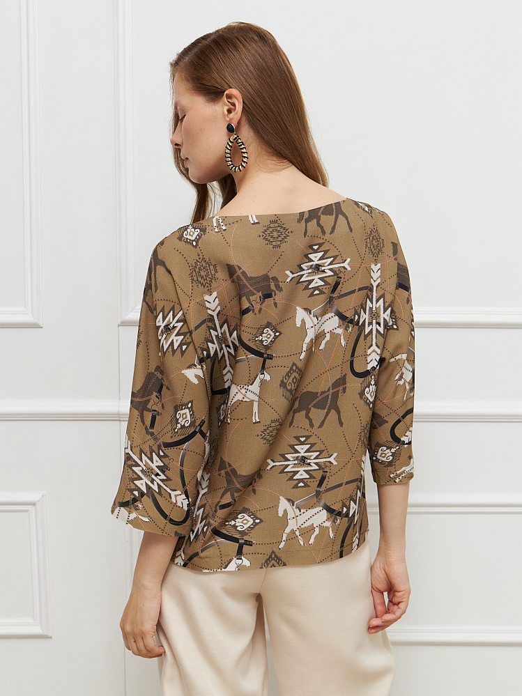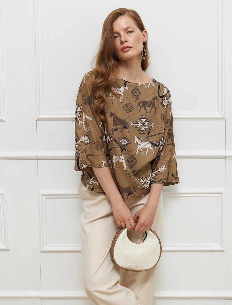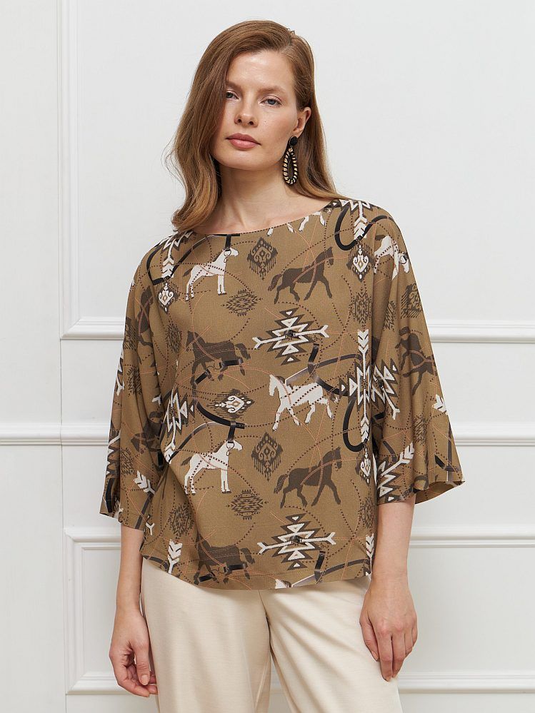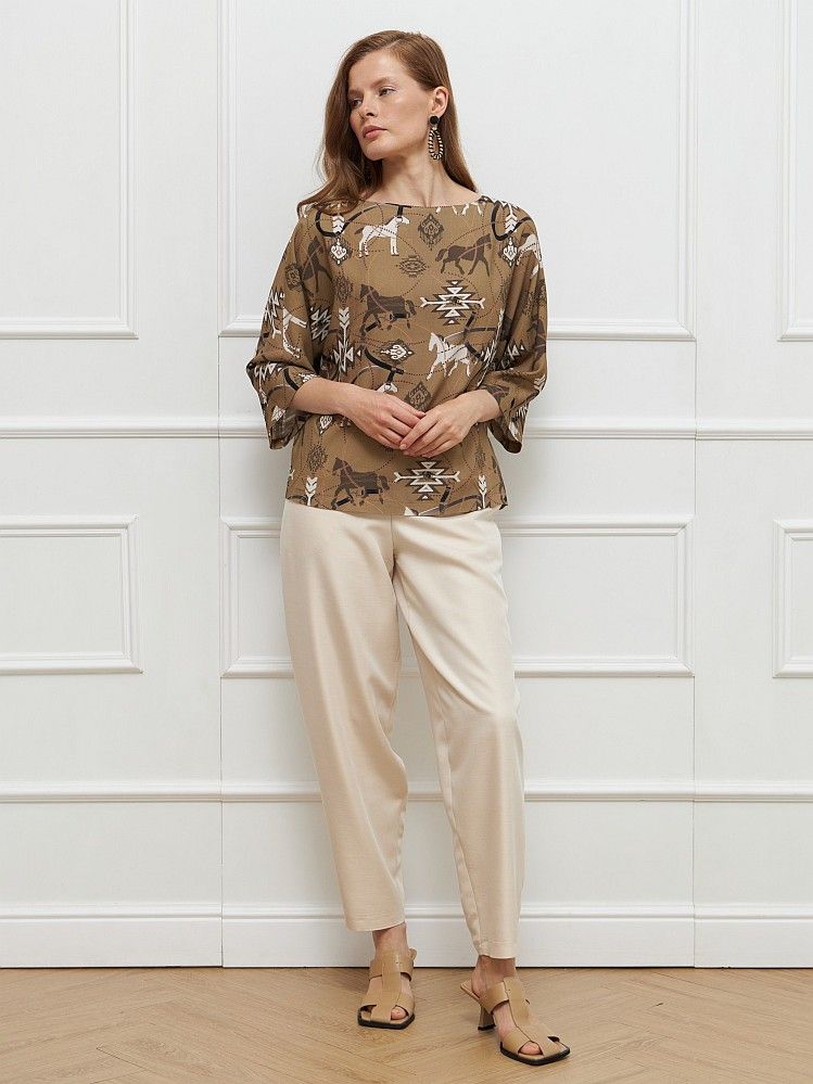 Свободная блузка силуэта «летучая мышь» выполнена из вискозной ткани с авторским принтом, изображающим грацию и красоту лошадей. Такая модель не нуждается в декоре и выступает акцентом в образе с однотонными вещами. На фото блузка представлена с брюками Б-03 ЛБИ(Л5).