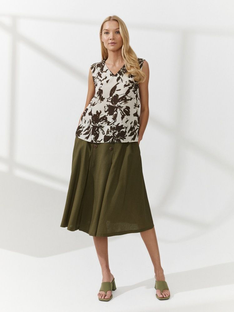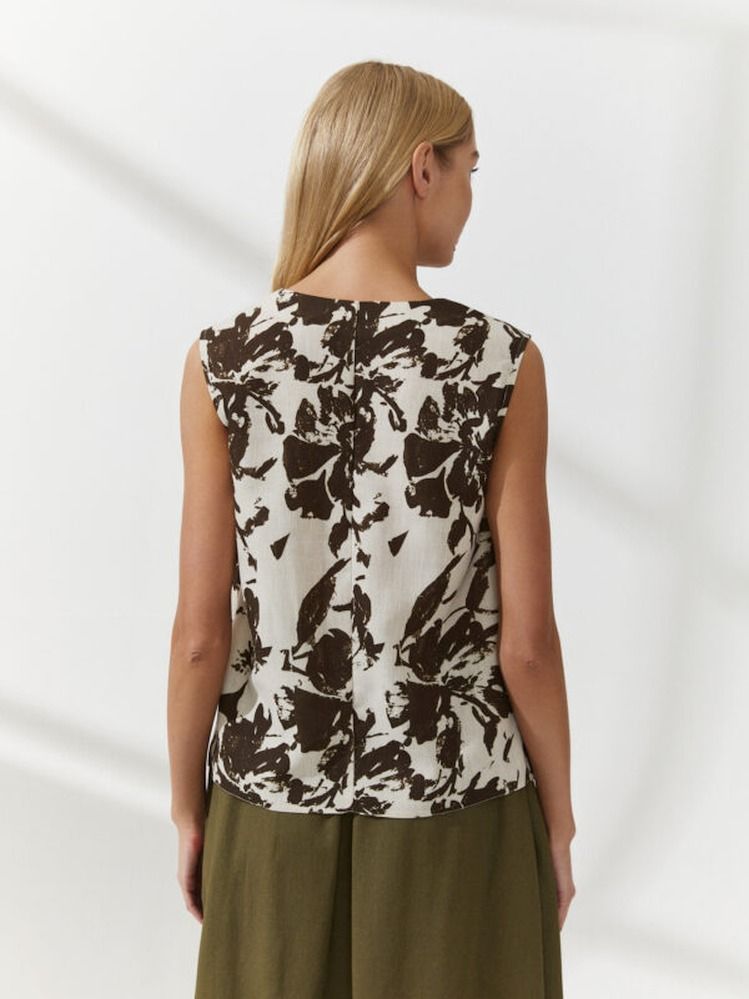 Слегка расклешенная блузка-топ без рукавов выполнена из тонкого дышащего материала, фактура и свойства которого имитирует натуральный лён. Крупный растительный принт в коричневых тонах - единственный декор модели