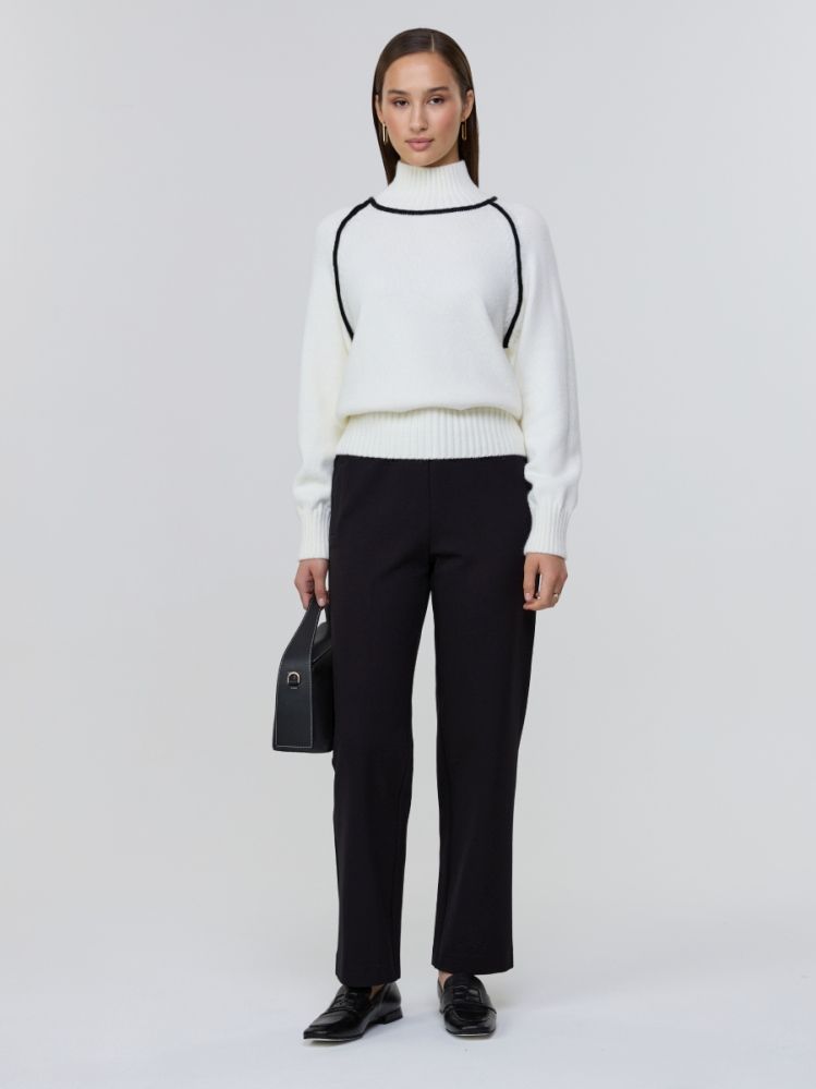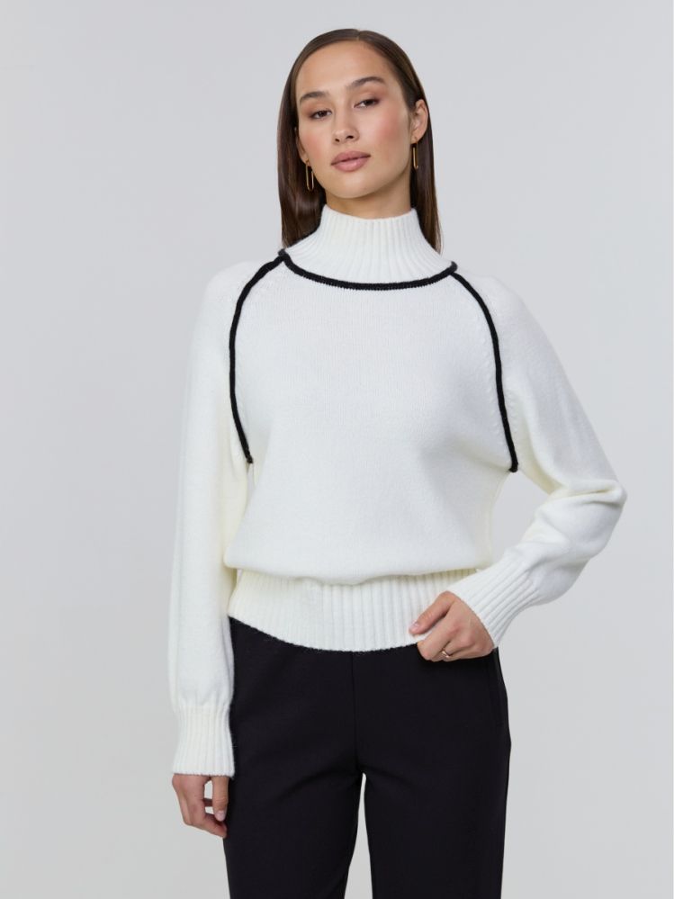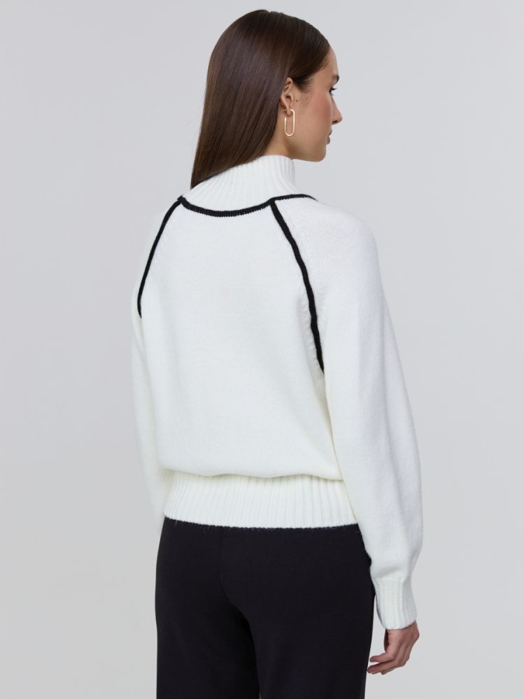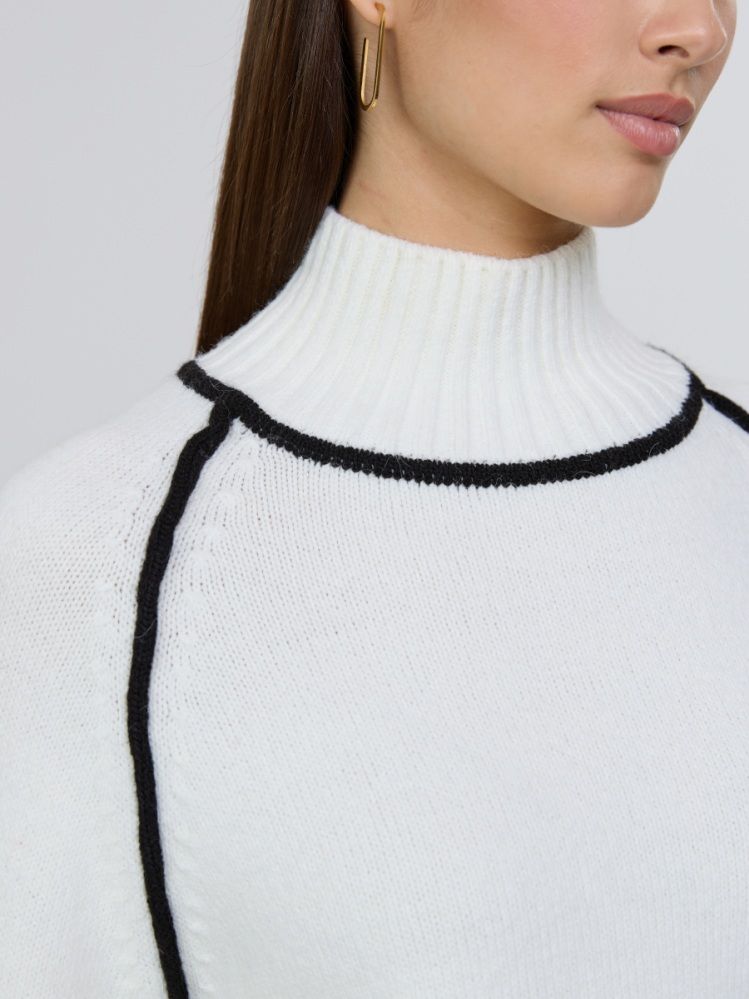 Базовый джемпер с контрастной отделкой, рукавом реглан и горловиной стойкой. Модель комфортная и теплая, подходит для ношения в офисе и на прогулке, отлично сочетается с базовым гардеробом. Вертикальные полоски вытягивают силуэт визуально.