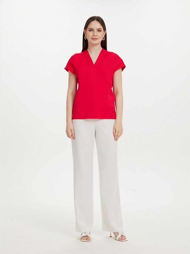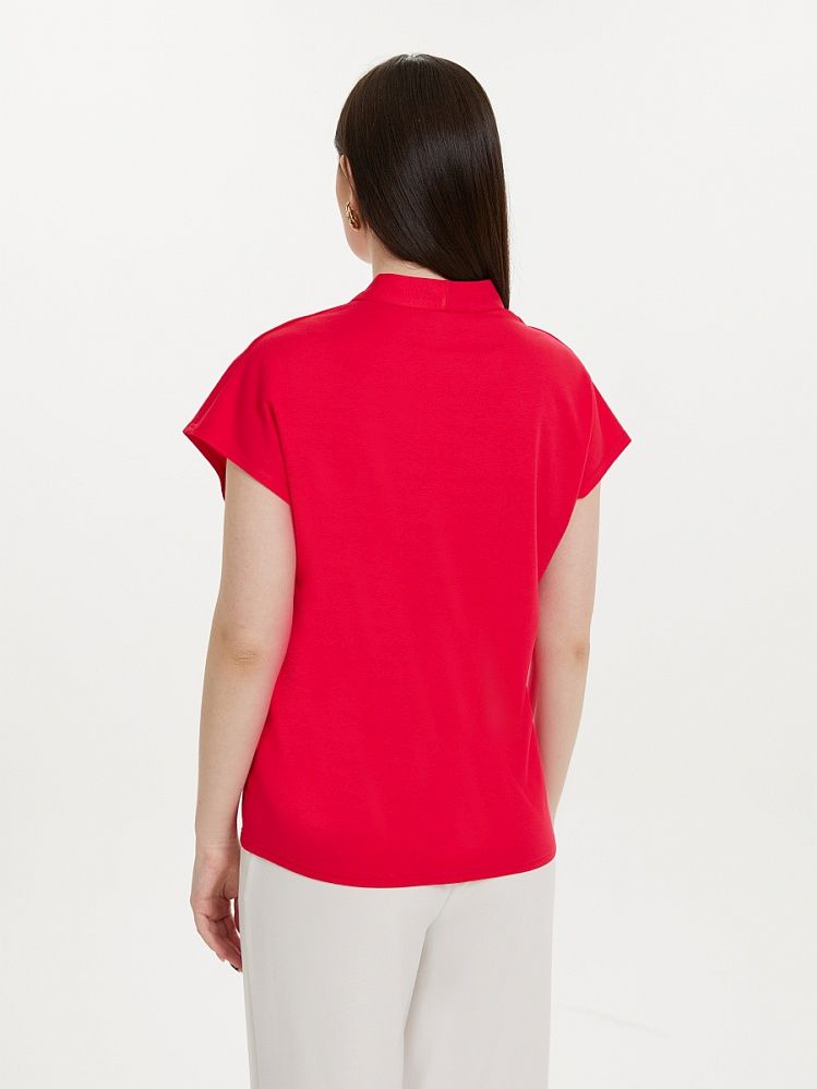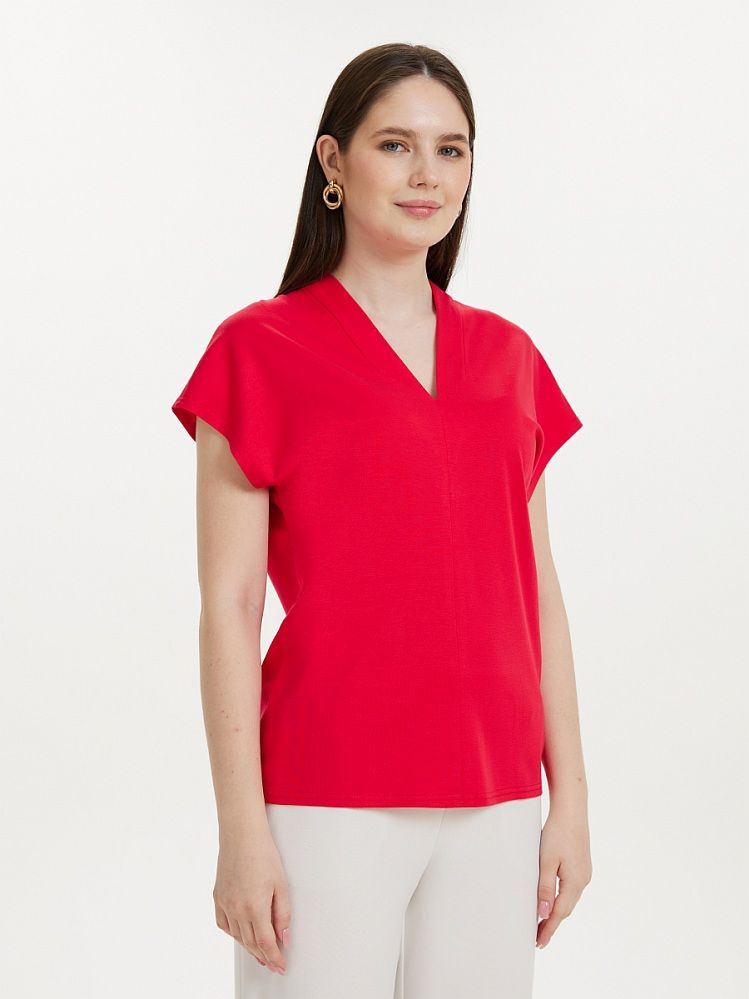Блуза из мягкого пластичного материала. V-образный вырез удлинняет линию шею. Полустойка. Крой кимоно. Прямой свободный силуэт. Длина до линии бёдер.