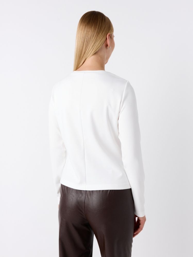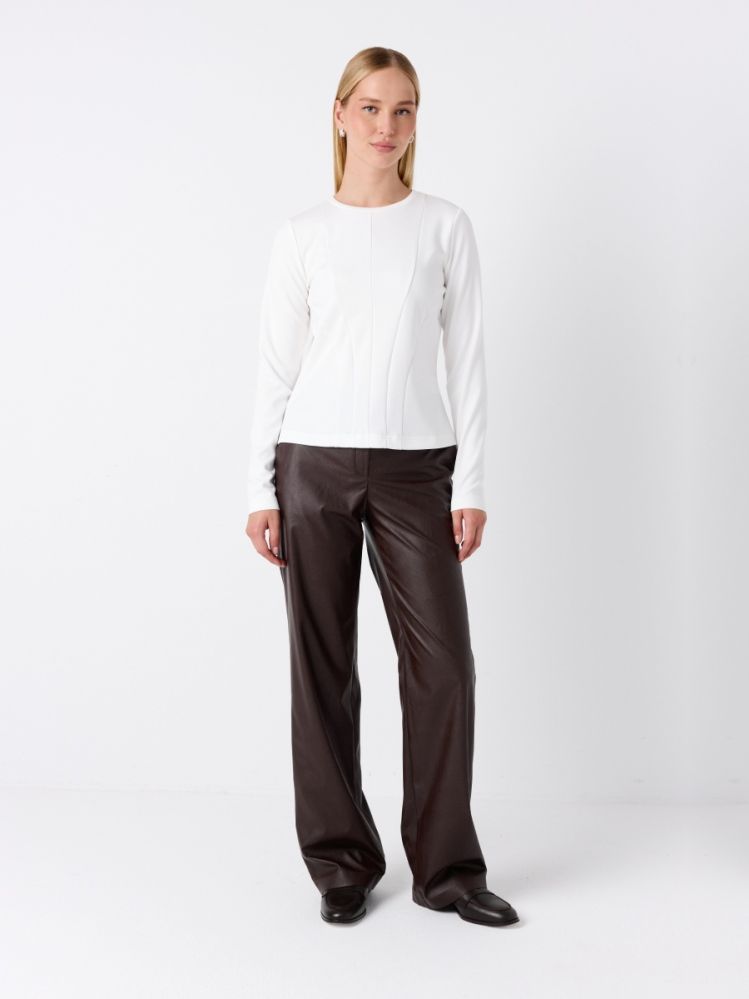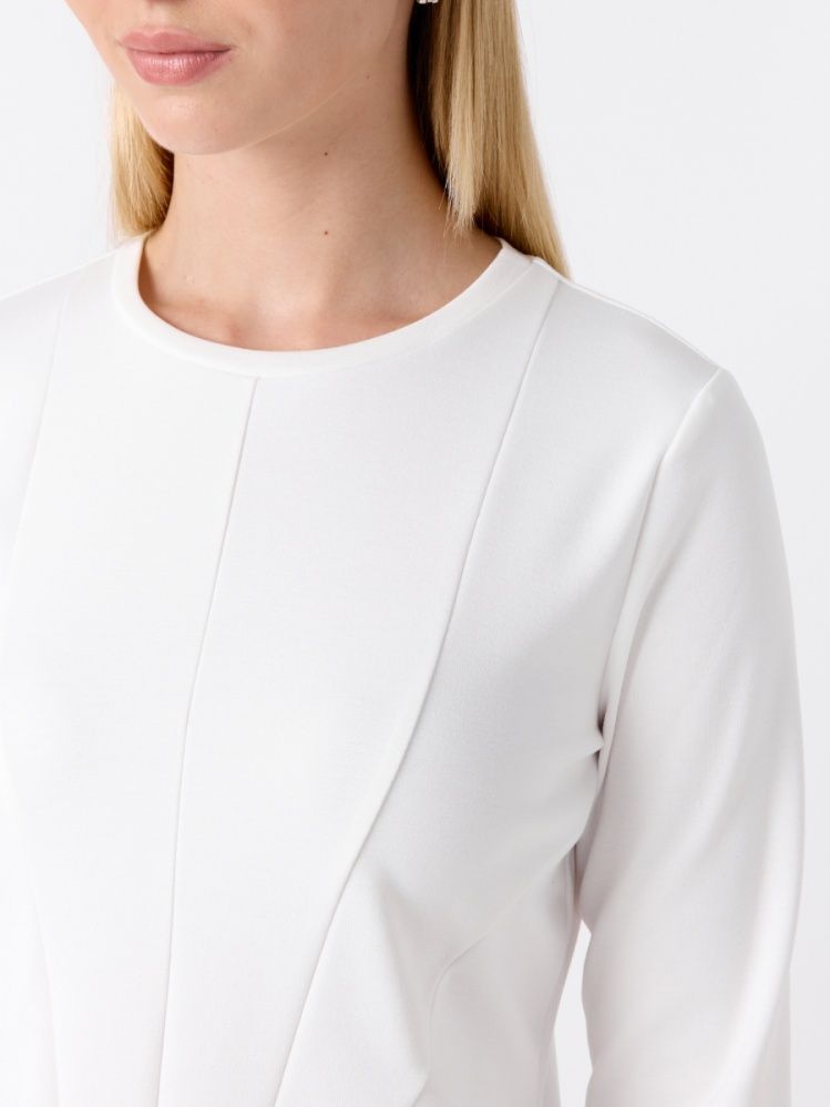 Актуальная модель лонгслива из мягкого трикотажа в молочном оттенке. Комфортная посадка по фигуре, полу-прилегающий силуэт, рельефные швы с имитацией корсетных линий, укороченная длина изделия.