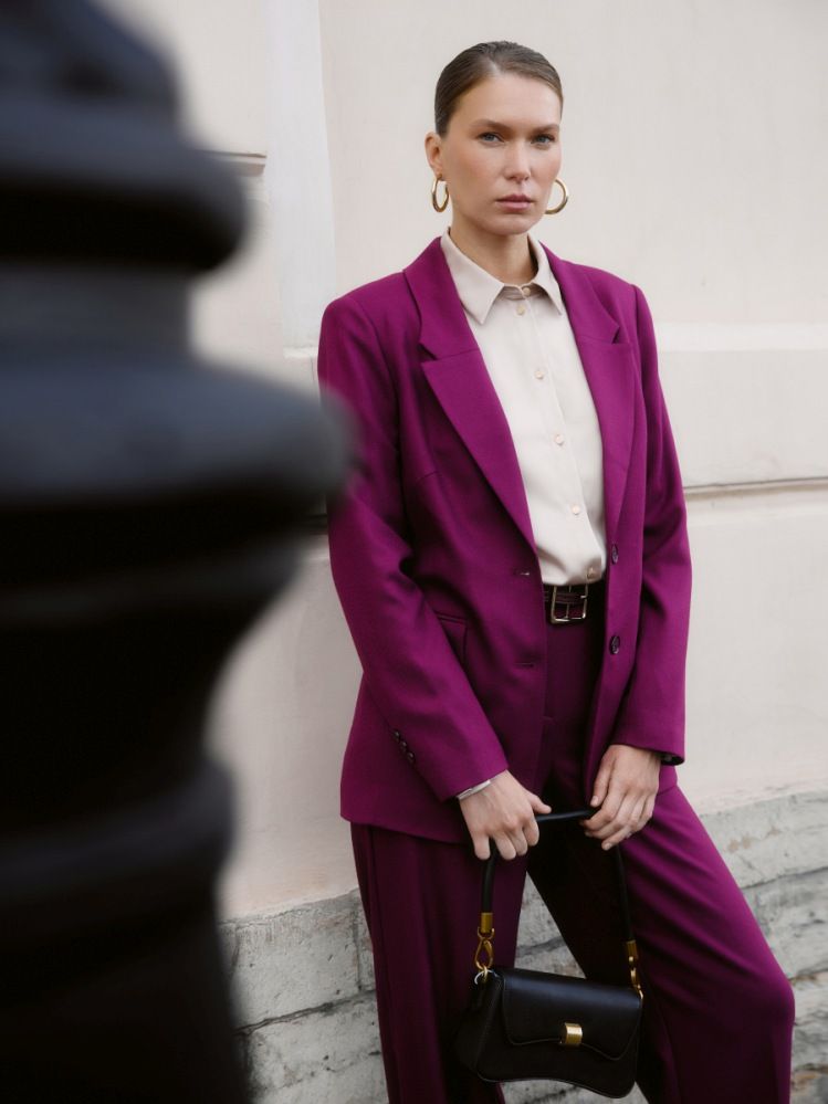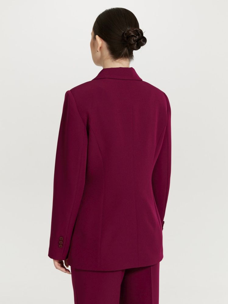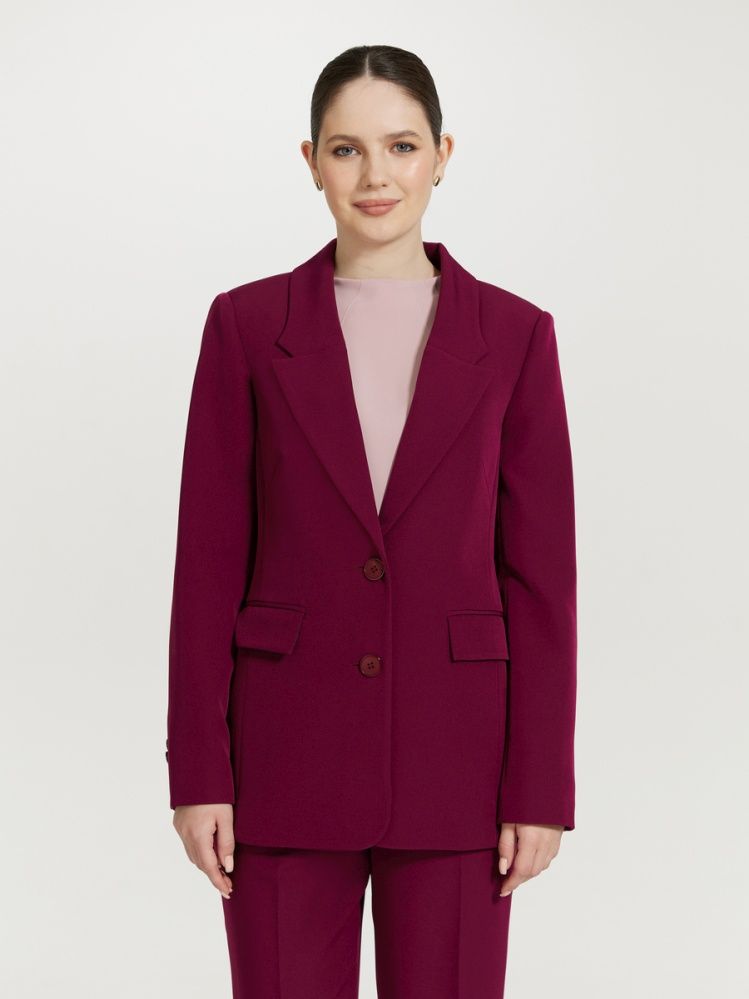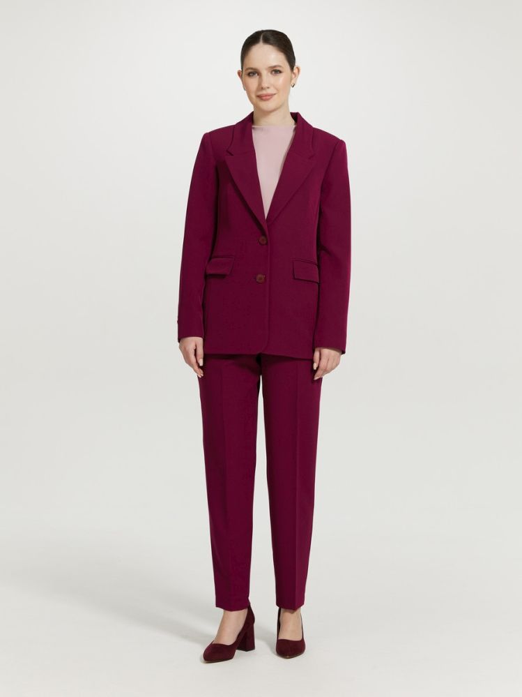 Однобортный жакет полуприлегающего силуэта. Отличительная особенность кроя - трендовый воротник архитектурной формы. Модель выполнена из комфортной костюмной ткани цвета красной сливы. Составляет комплект с брюками 2.5.2-22 и 2.5.1-107
