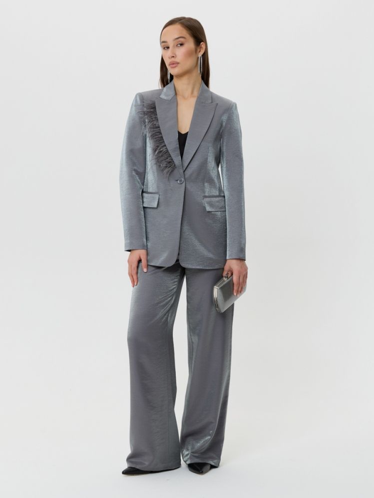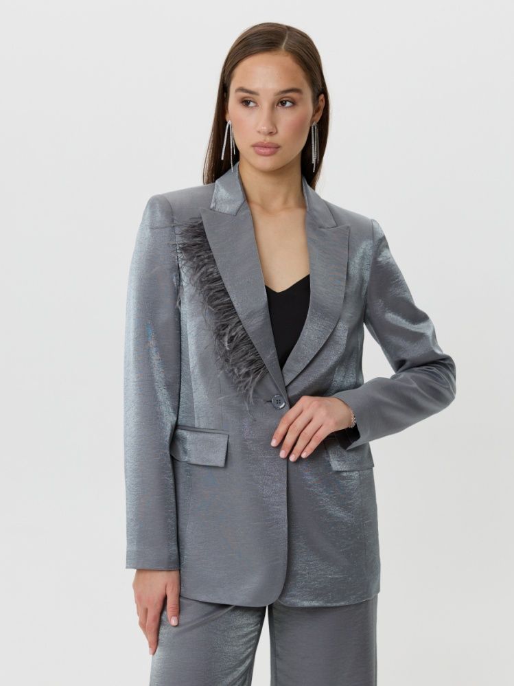 Представляем вашему вниманию элегантный жакет стального оттенка, выполненный из ткани с переливом мерцания. Прямой силуэт и трендовый крой лацкана создают стильный и современный образ. Лацкан украшен съемными перьями в тон основной ткани, добавляя изысканности и уникальности. Застежка на пуговицу обеспечивает удобство, а поливискозный подклад гарантирует комфорт при носке. Этот жакет идеально дополнит ваш гардероб, придавая вашему образу статусность и утонченность.