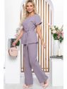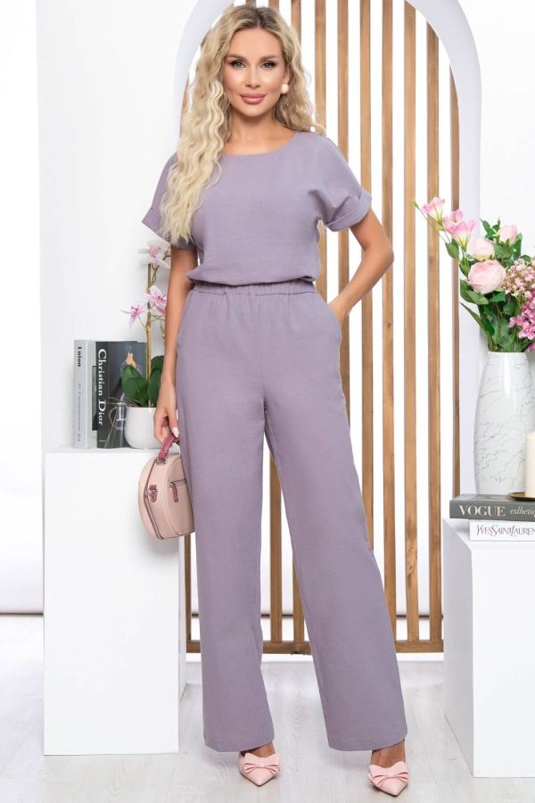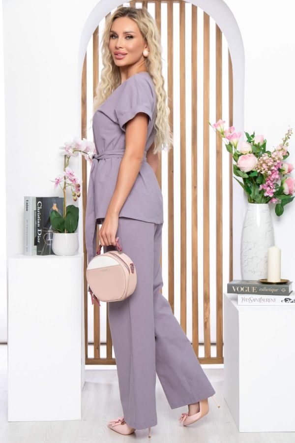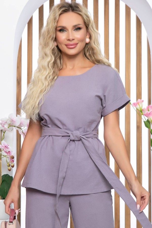 Костюм из хлопка, простой в своём исполнении, обладает особым шармом. Прямые брюки, свободного кроя верх, красивый цвет создают тот самый гармоничный образ стильной леди большого города. Брюки на резинке, есть карманы. Блуза свободного кроя, рукав цельнокроенный, короткий, с отворотом. В комплекте пояс из основной ткани.