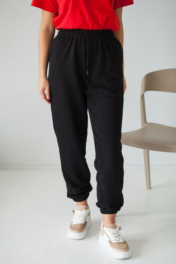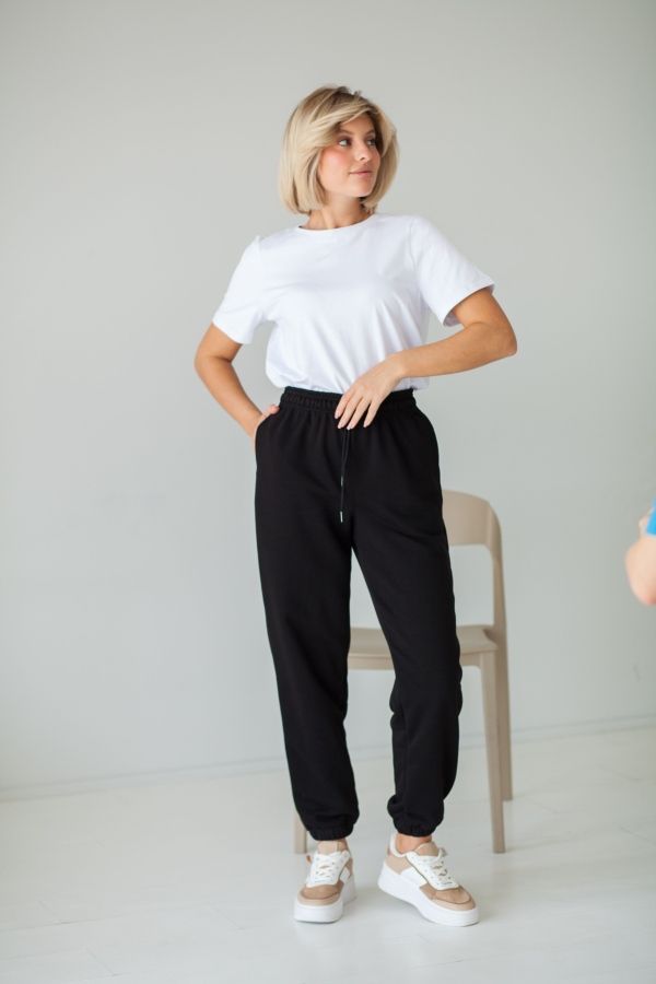 Брюки-джоггеры с высокой посадкой, пояс на резине со шнурком, низ изделия на резине, в боковых швах карманы. Длина по внутреннему шву ок. 73см