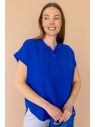 "Ткань: вискоза с эффектом «крэш». Блузка свободного, по горловине лежачая стойка, переходящая в планку с пуговицами, рукав цельнокроенный, по спинке – кокетка. Рукав короткий. Длина ок.65 см.