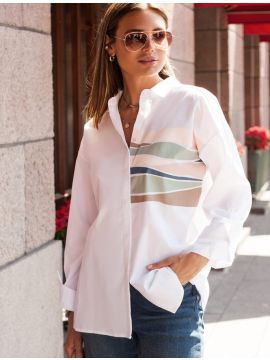 Ткань: креп. Рубашка прямого покроя, Рукав втачной, воротник на стойке, спереди застежка. Рукав длиннный с манжетом на одну пуговицу с декоративным отворотом.